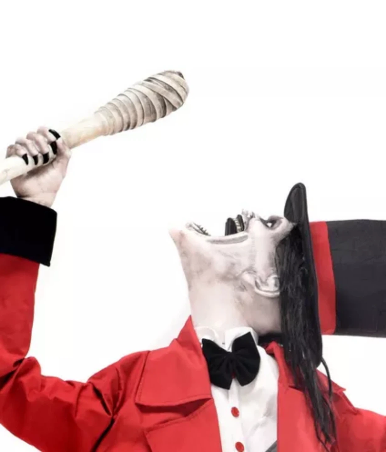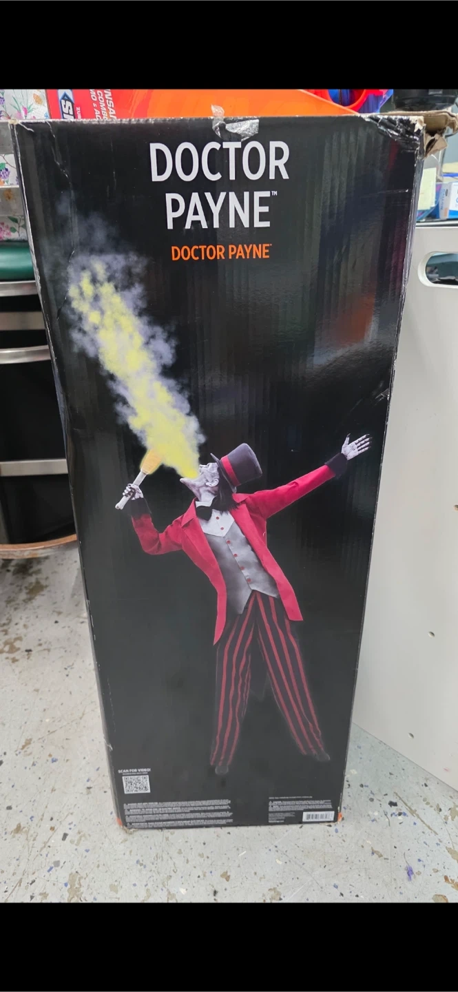Behold Dr. Payne, the sinister showman, perched upon stilts and cloaked in a blood-red coat that pierces through the darkness. With his neck stretched toward the sky, he appears to breathe fire into the night with bursts of light and smoke escaping his ghastly grin; each exhale casting a spell of terror on all who dare to venture close.
