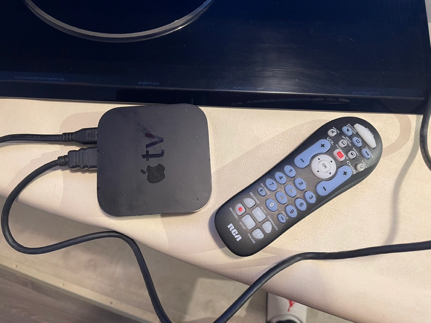 Unfortunately, I do not have the original remote for either the TV or Apple TV but I do have a universal remote to control both.