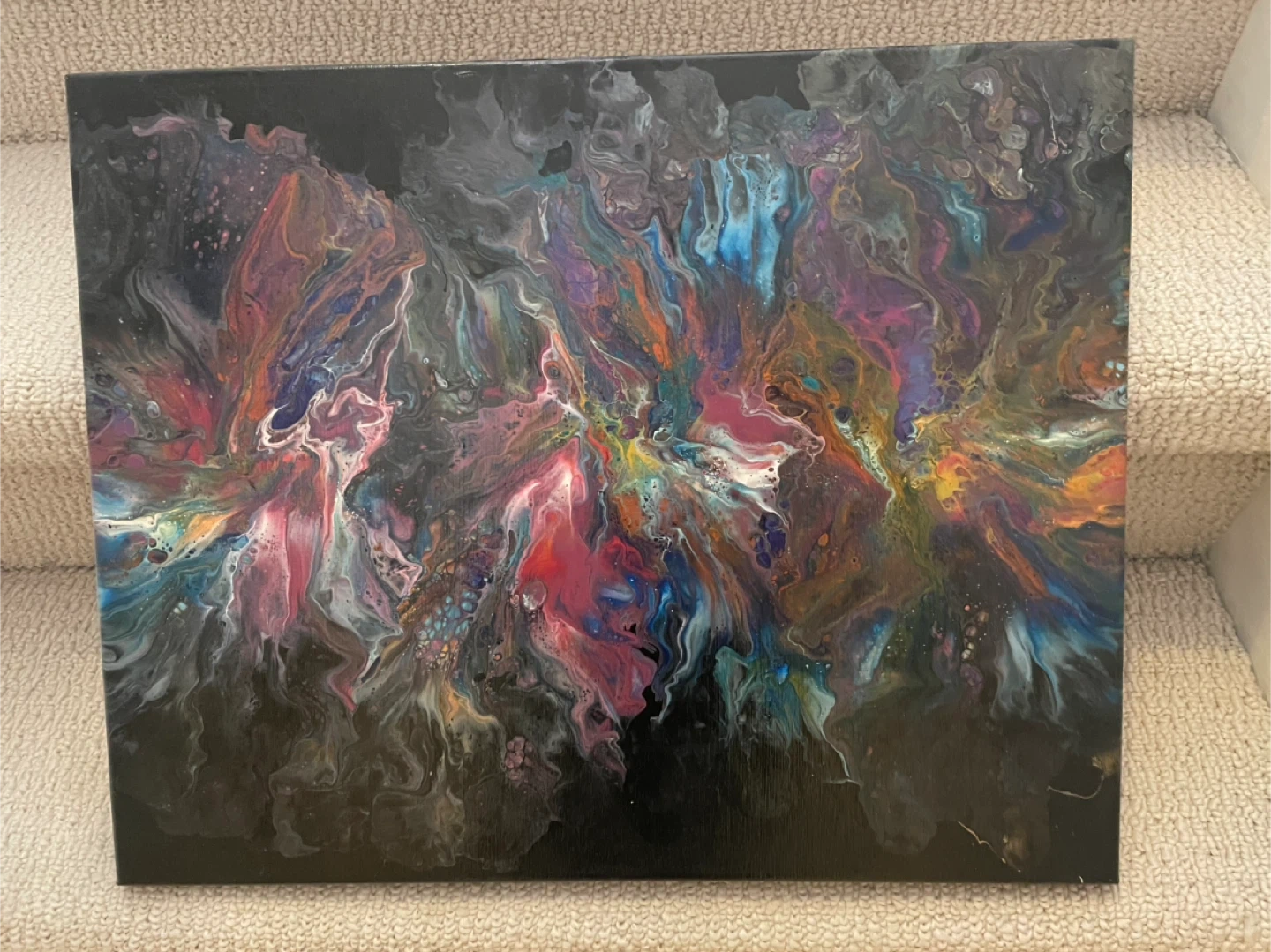 This is a one of a kind fluid acrylic abstract painting on canvas. The colours are vibrant and create a mesmerizing effect. It would look great in any room!