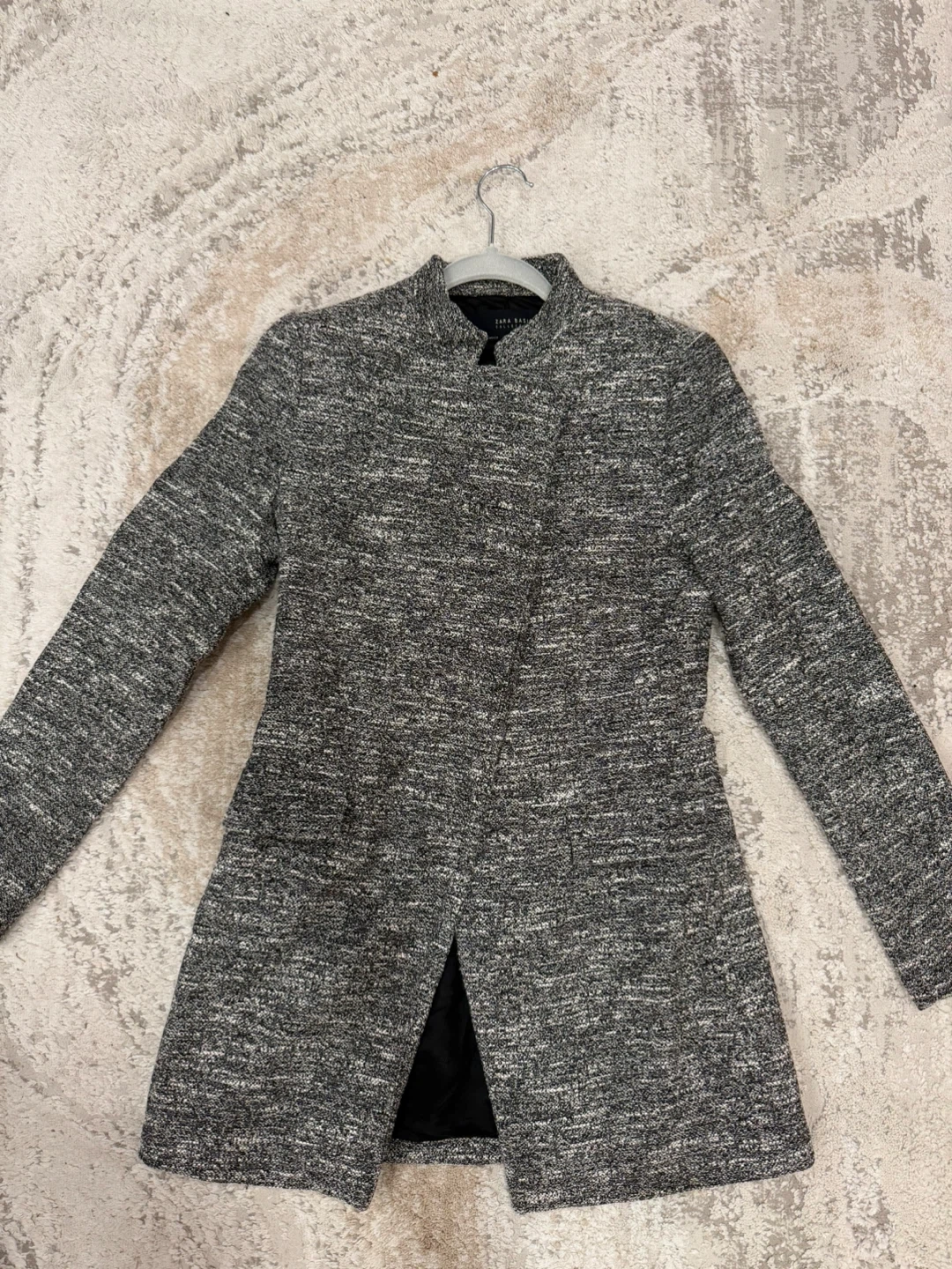 Selling a Zara coat/blazer with a textured weave in gray. It's a stylish piece that can be dressed up or down. Perfect for adding a touch of sophistication to any outfit!