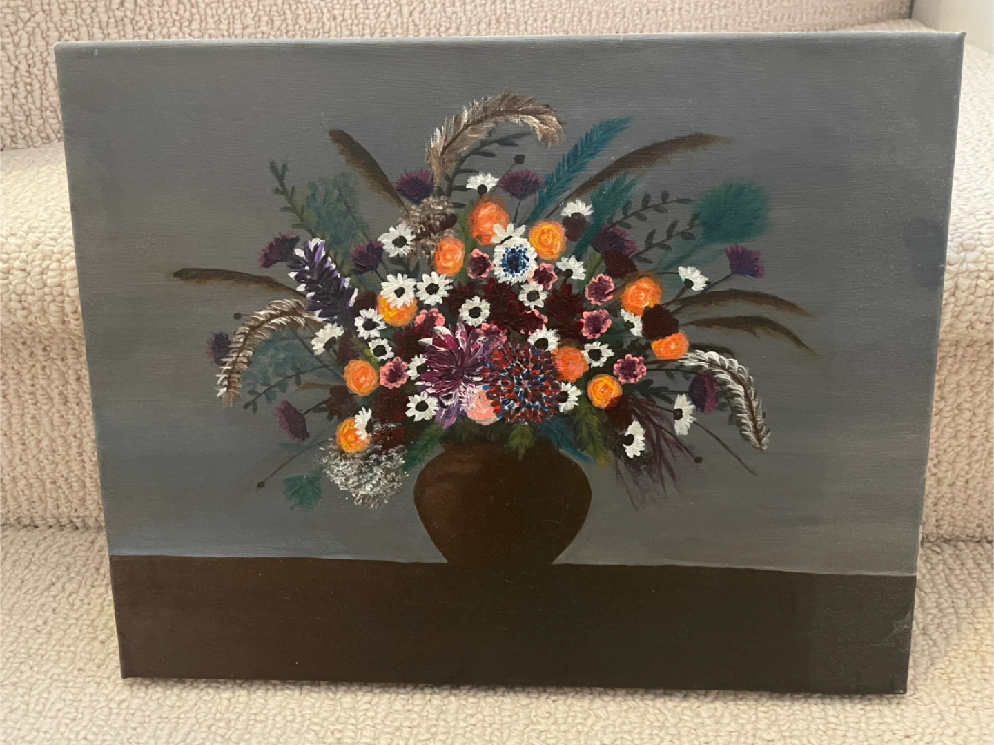 This is a lovely floral still life painting, perfect for adding a touch of colour to any room! It features a variety of flowers in a vase against a grey background