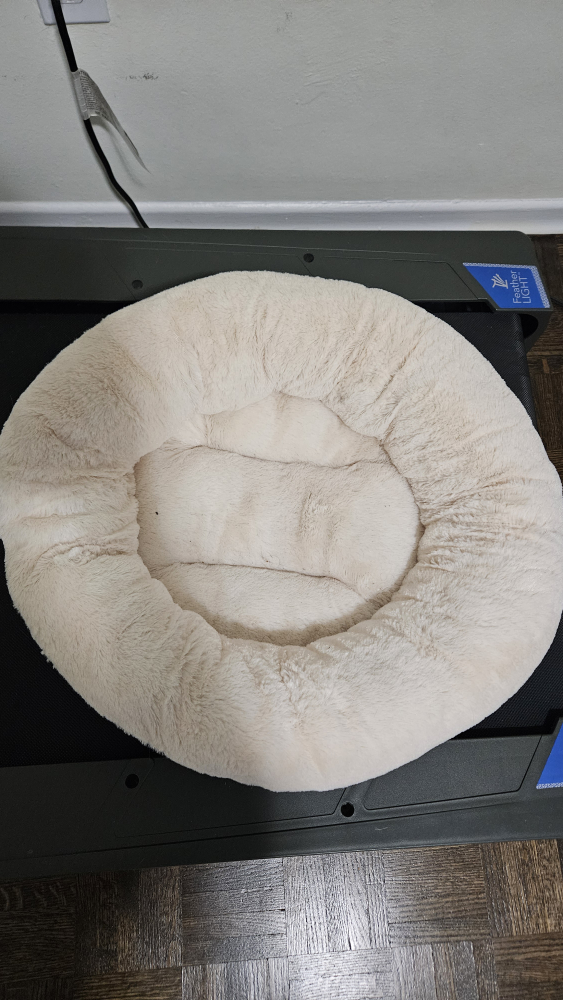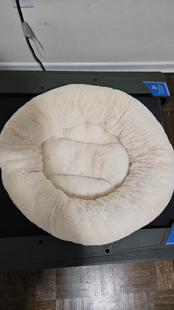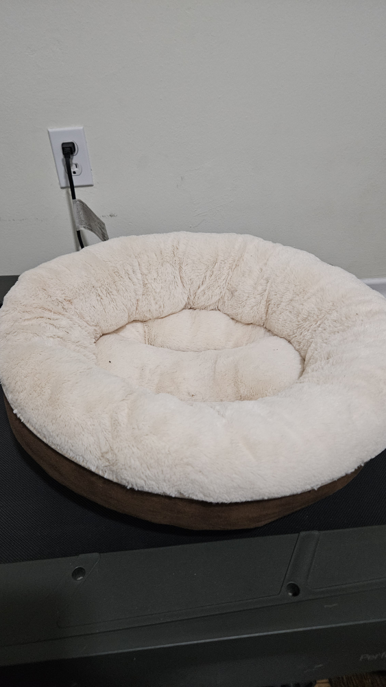 Selling a comfy round pet bed! It's a soft, small bed in a cream colour, perfect for your furry friend to curl up in. Brown suede-like bottom. Suitable for cats or small dogs. It's in great condition and ready for a new home.