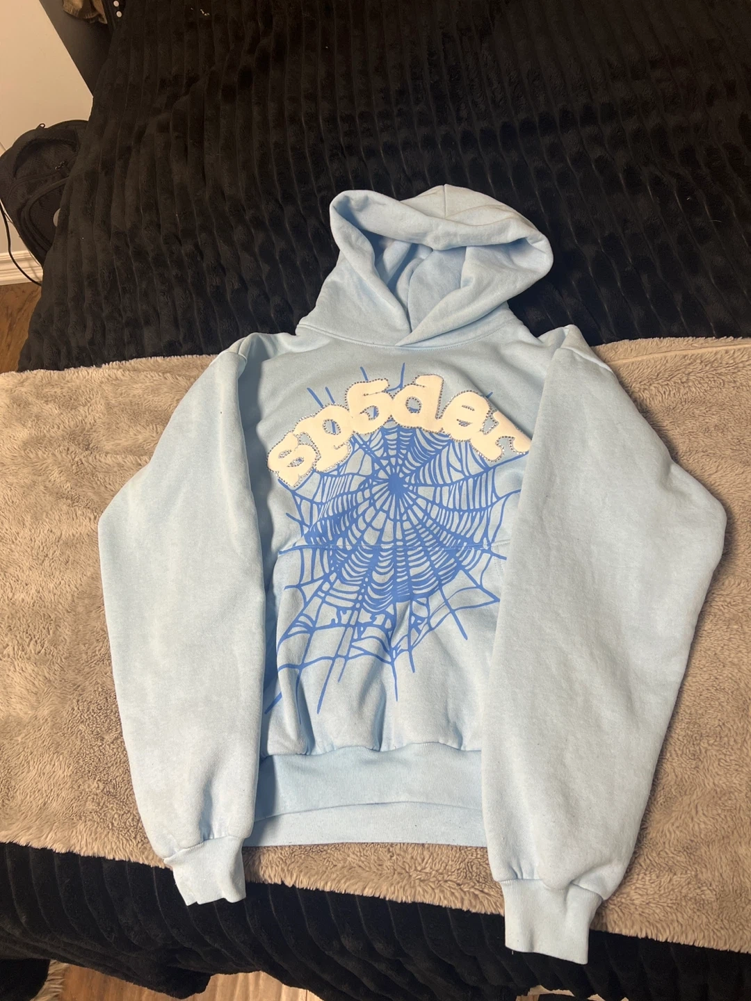 Selling a SP5DER hoodie in light blue. It's a size small and made of 100% cotton. The care instructions are: machine wash cold and tumble dry low. It was designed in the USA