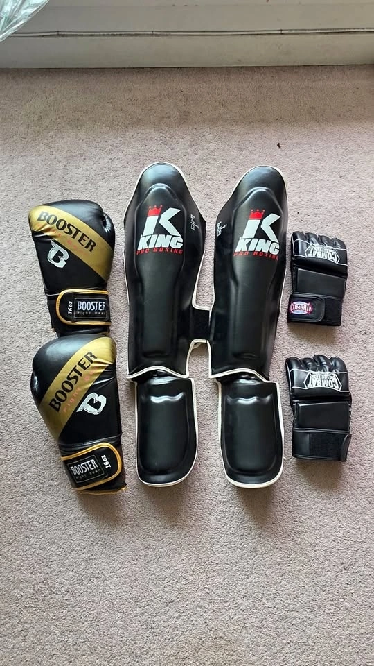 Set of 16oz booster brand boxing gloves (some visible marking refer pic.) king pro boxing shin pad xl size (made in Thailand)used but new condition needs some cleaning , Combat sport sparring gloves (XL) good used condition , preferred to sell as a set, for single item send me your offer, asking $150 for full set or best offer, pick up only, pick up location Surrey (Scott Road & 76ave), Cash or E-transfer only, No holding without advance payment , Thank You.