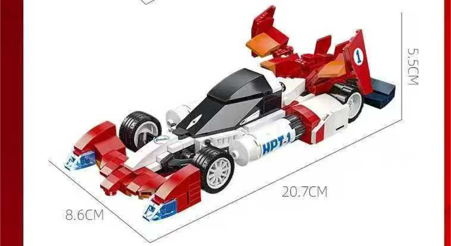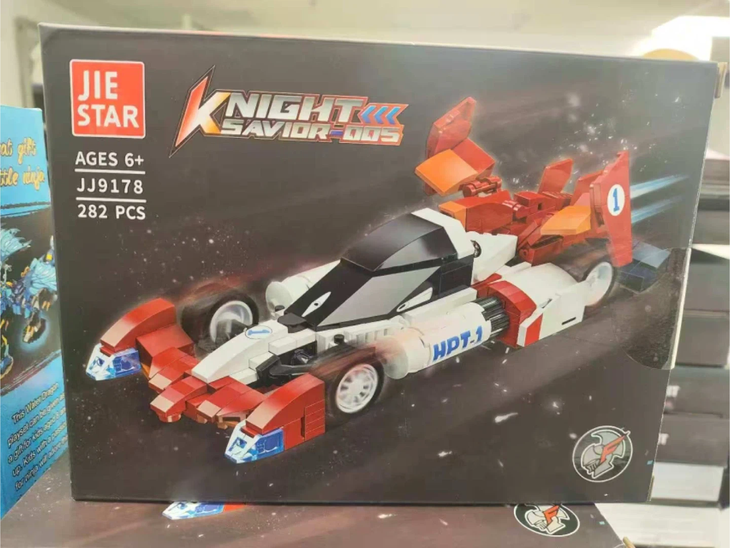 Selling a JIE STAR Knight Savior 005 building set! It's suitable for ages 6 and up and includes 282 pieces. The box shows the assembled model, which is a cool race car design in red, white, and black. Perfect for a fun building project!