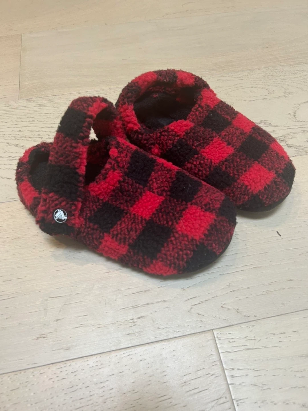 Super cozy Crocs slippers size 4 in a red and black plaid pattern! These are perfect for keeping your feet warm on chilly days. They feature a cute bear design and the classic Crocs comfort.
