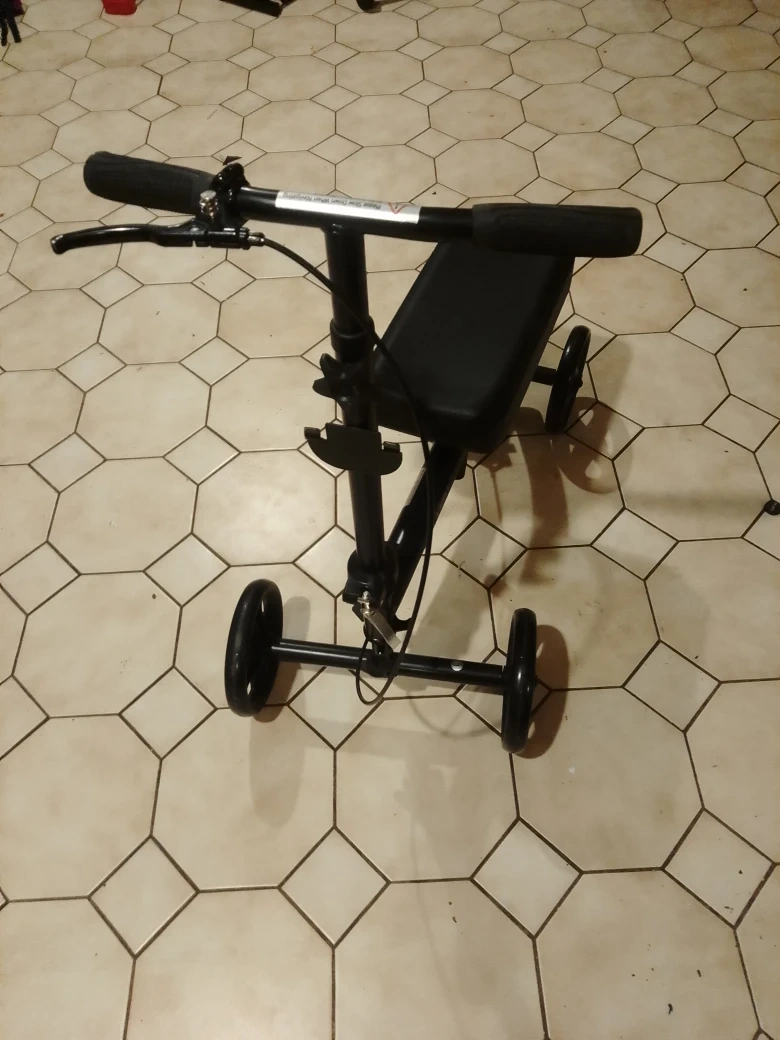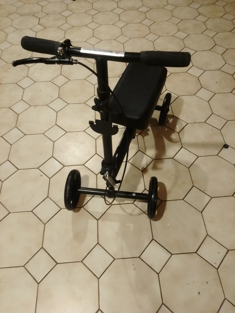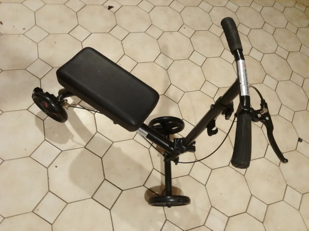 Selling a knee walker scooter in black. It's in great condition and ready for a new home! Perfect for getting around while recovering from a leg or foot injury. It has a comfortable seat and easy-to-use hand brakes.