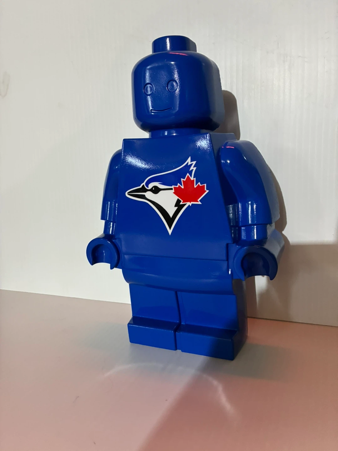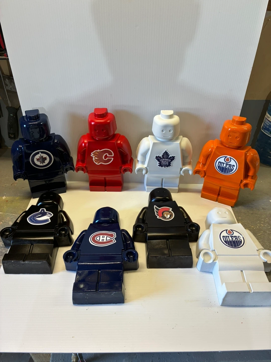 Check out these unique concrete Lego figures! Some feature cool NHL team logos like the Oilers, Flames, and Maple Leafs. They'd make a fun addition to any space or a great gift.