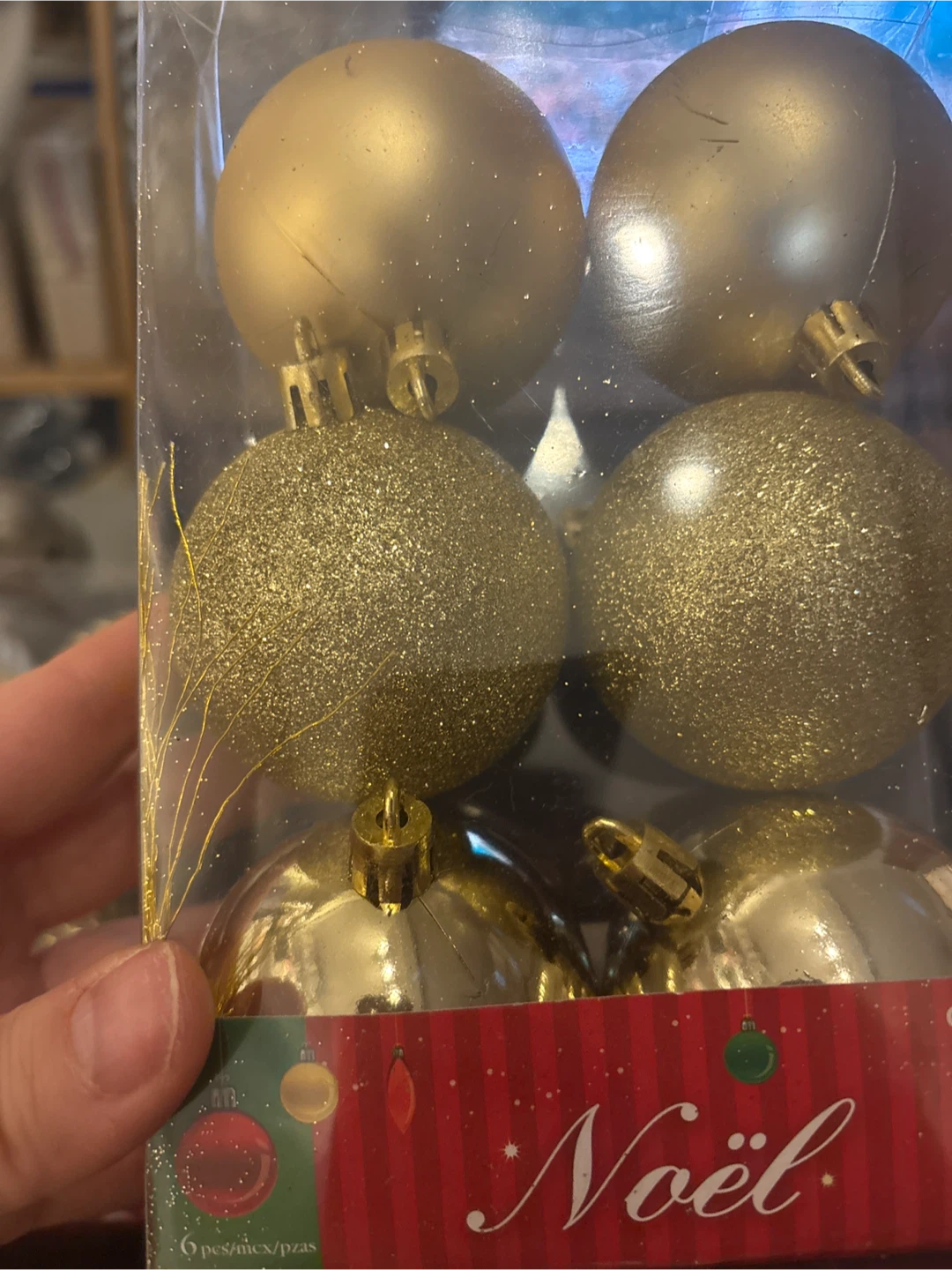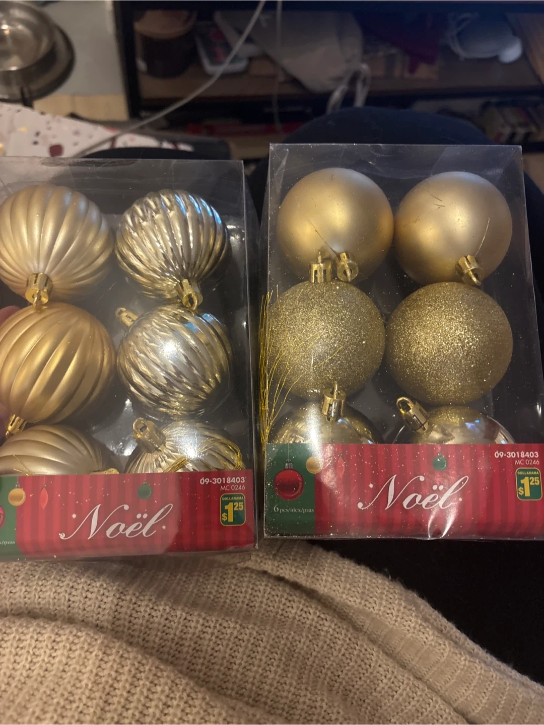 Selling two sets of Noël Christmas ornaments, each containing 6 pieces! One set features classic gold round ornaments, while the other has a swirled gold design. Perfect for adding a touch of festive cheer to your tree this holiday season