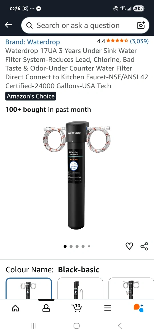 Selling a Waterdrop WD-17UA under sink water filter system in black. It's designed to reduce chlorine for great-tasting water and provide bottle-like fresh taste. This system is easy to install and maintain, with a 36-month long lifespan. It measures 19.1 inches in height and 3.6 inches in diameter