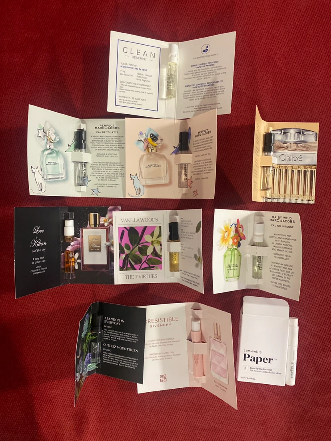 Selling a variety of perfume samples! Includes popular brands like Marc Jacobs, Chloe, Givenchy, Clean, Kilian, The 7 Virtues, Nest, and Commodity. Perfect for trying out new scents before committing to a full bottle:)