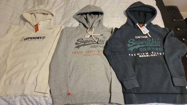 Brand new Superdry premium vintage fleece hoodies (Tokyo, Japan). Never worn or tried on, tags intact. 3 colours and all are size L. They fit small so I'm a medium but these are all size L.