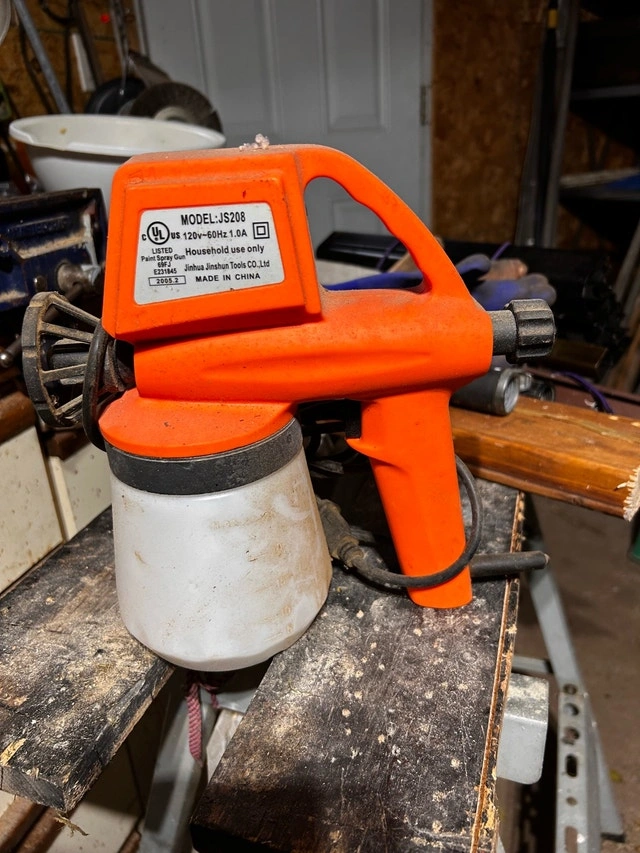 Get your painting projects done with this Jinhua JS208 Paint Sprayer! This sprayer is used, but ready to help you achieve a smooth finish on your next DIY endeavour. Please note the cup is cracked and will need to be replaced. Specifications: * Model: JS208 * Power: 120V-60Hz, 1.0A * Type: Household Use Only * Manufacturer: Jinhua Jingshun Tools Co. Ltd I'm decluttering my workspace, and it's time for this trusty tool to find a new home. Don't miss out—if the ad's up, it's up for grabs! Cash only