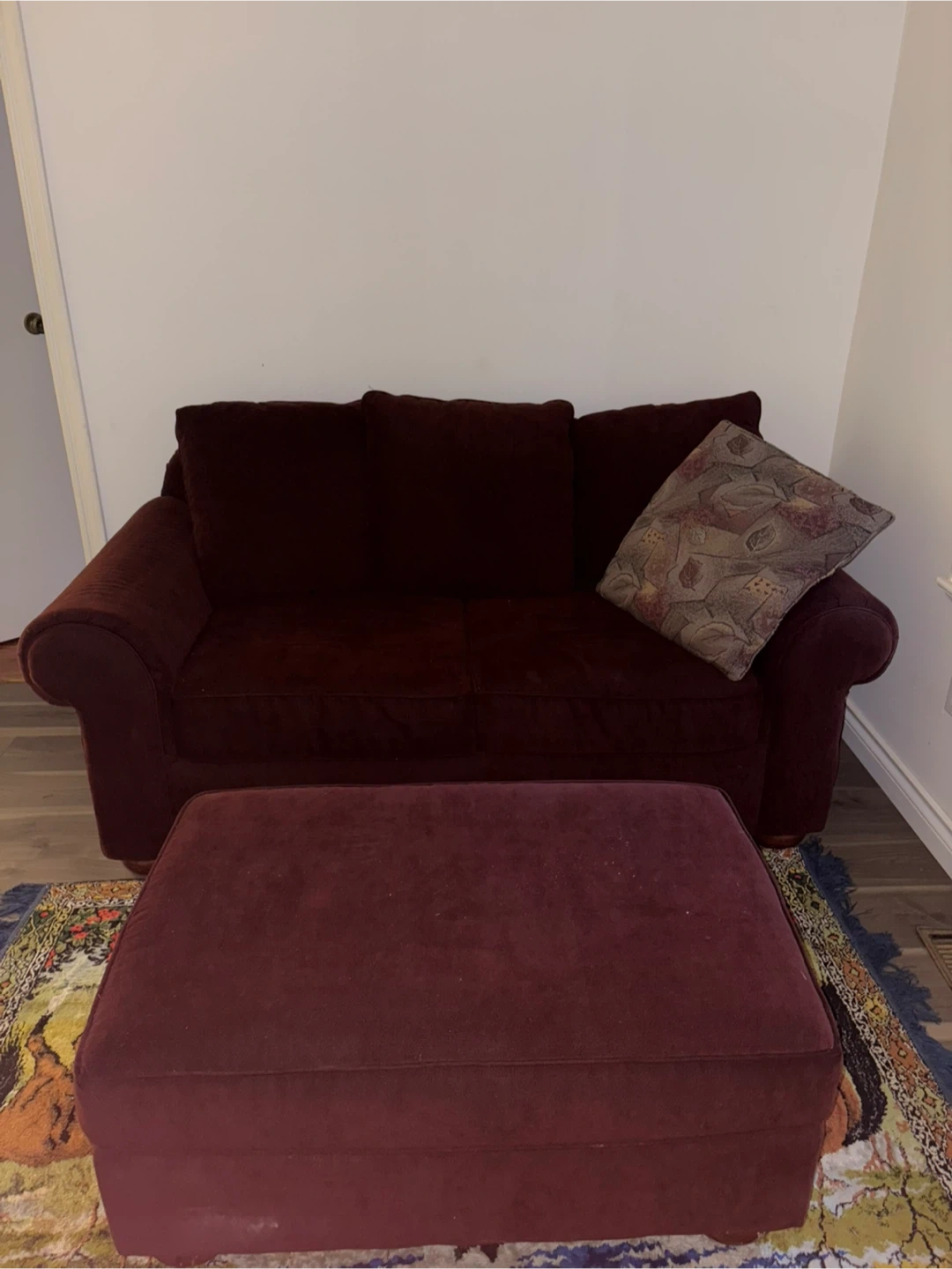 A comfy burgundy loveseat sofa with a matching ottoman, perfect for a small space or cozy corner! The sofa comes with three back cushions and an additional decorative pillow. It's in good condition I havent used it much.