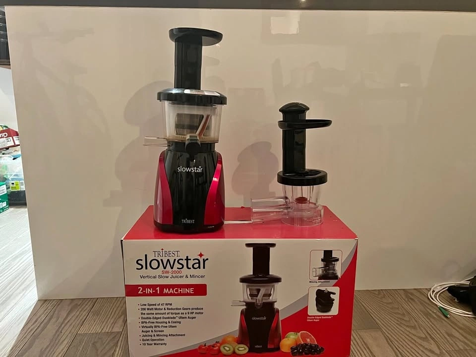 Selling a used Tribest Slowstar Juicer & Mincer in good condition. Great for making juice or nut butters (with mincing attachment). Comes with one juice cup and one mesh strainer (both unused).