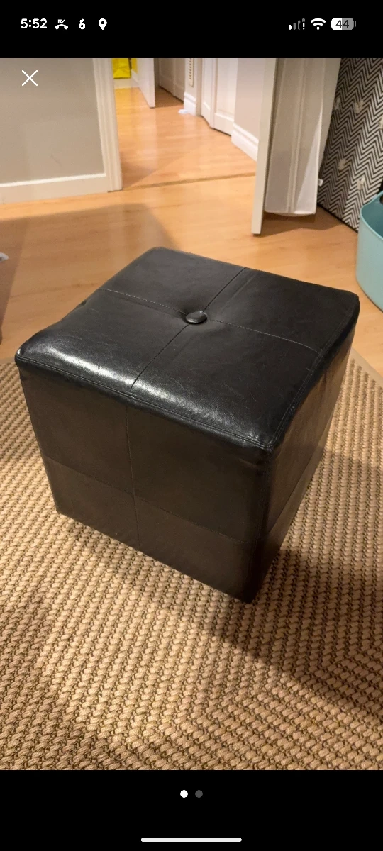 Selling a black faux leather storage ottoman. It's in good condition and would be a great addition to any living room or bedroom