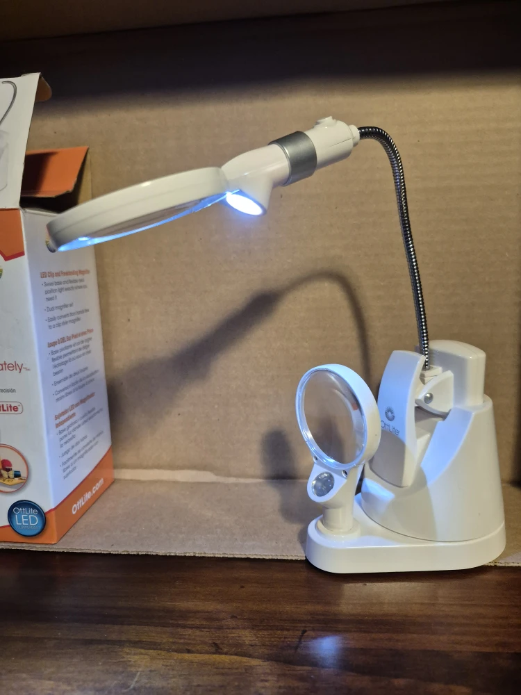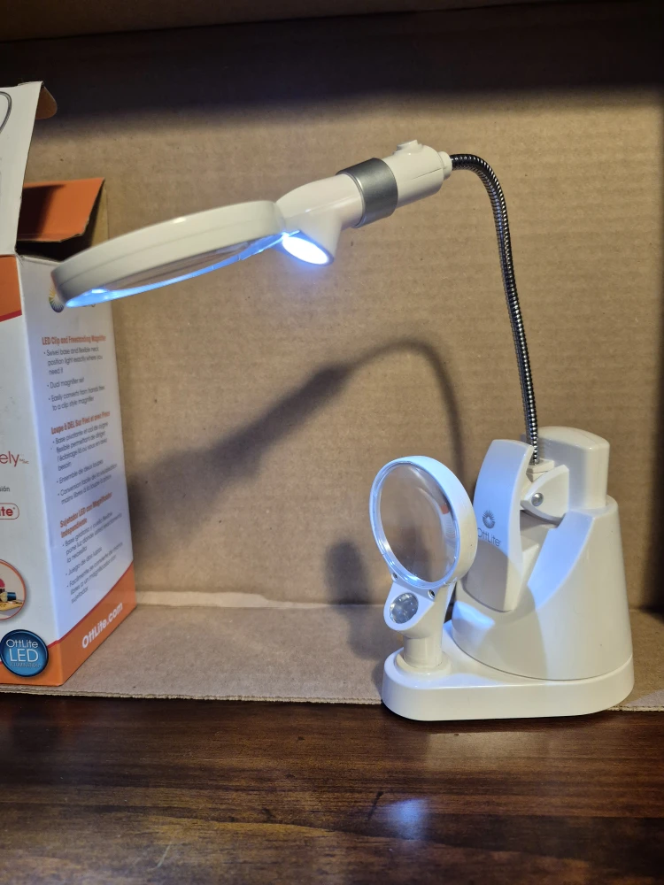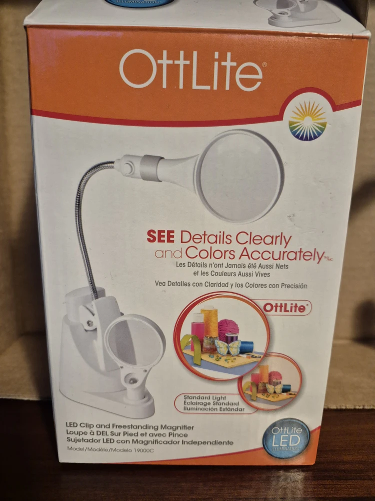 This OttLite LED Clip and Freestanding Magnifier is great for seeing details clearly and colours accurately! It's an LED clip and freestanding magnifier with a standard LED light and comes with its original box. The base size is 3 x 4 3/8 in / 7.6 x 11.1 cm. Height is adjustable to 16 1/4 in / 41.3 cm