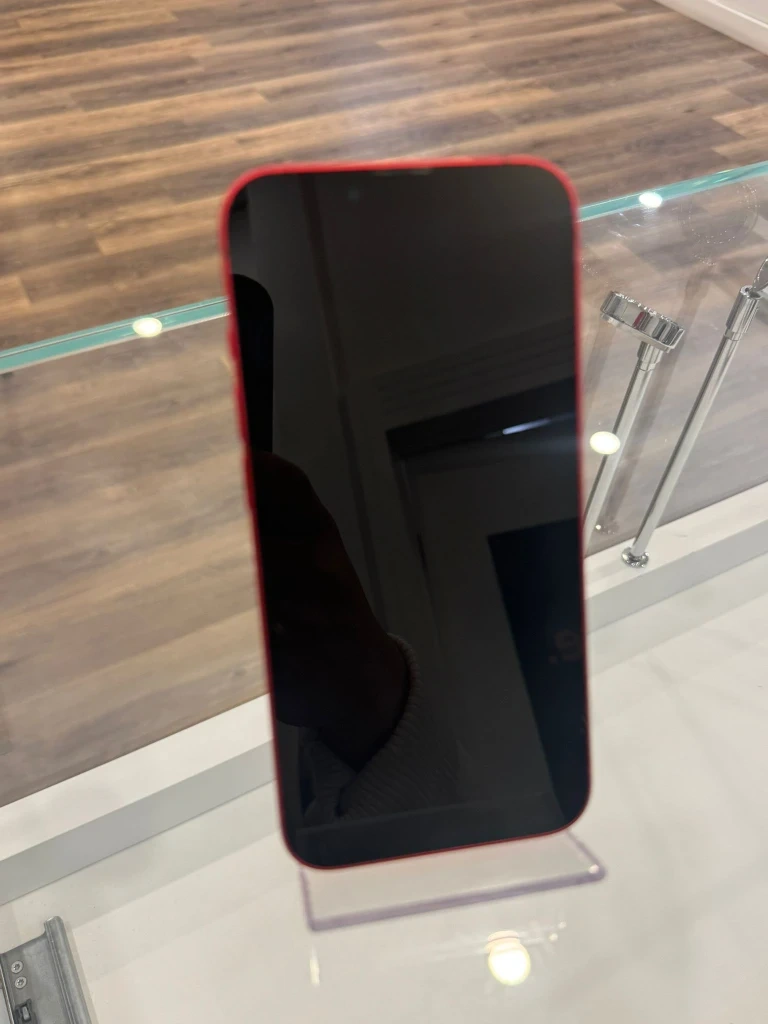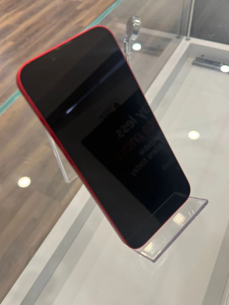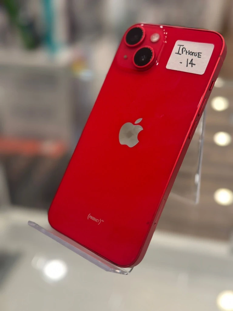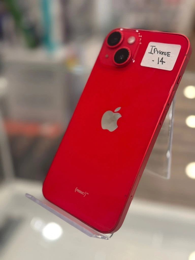 iPhone 14 in the iconic (PRODUCT)RED finish. The phone is presented on a clear stand, highlighting its vibrant, deep red color and glossy back panel. The design features flat edges and a central, contrasting Apple logo.