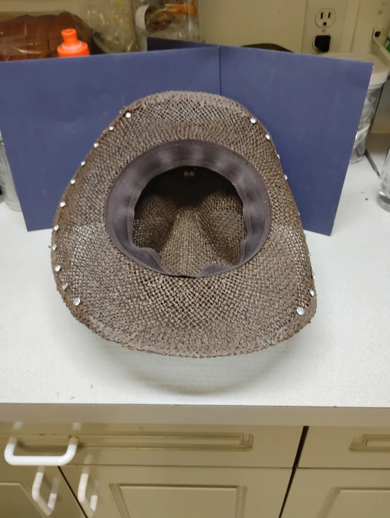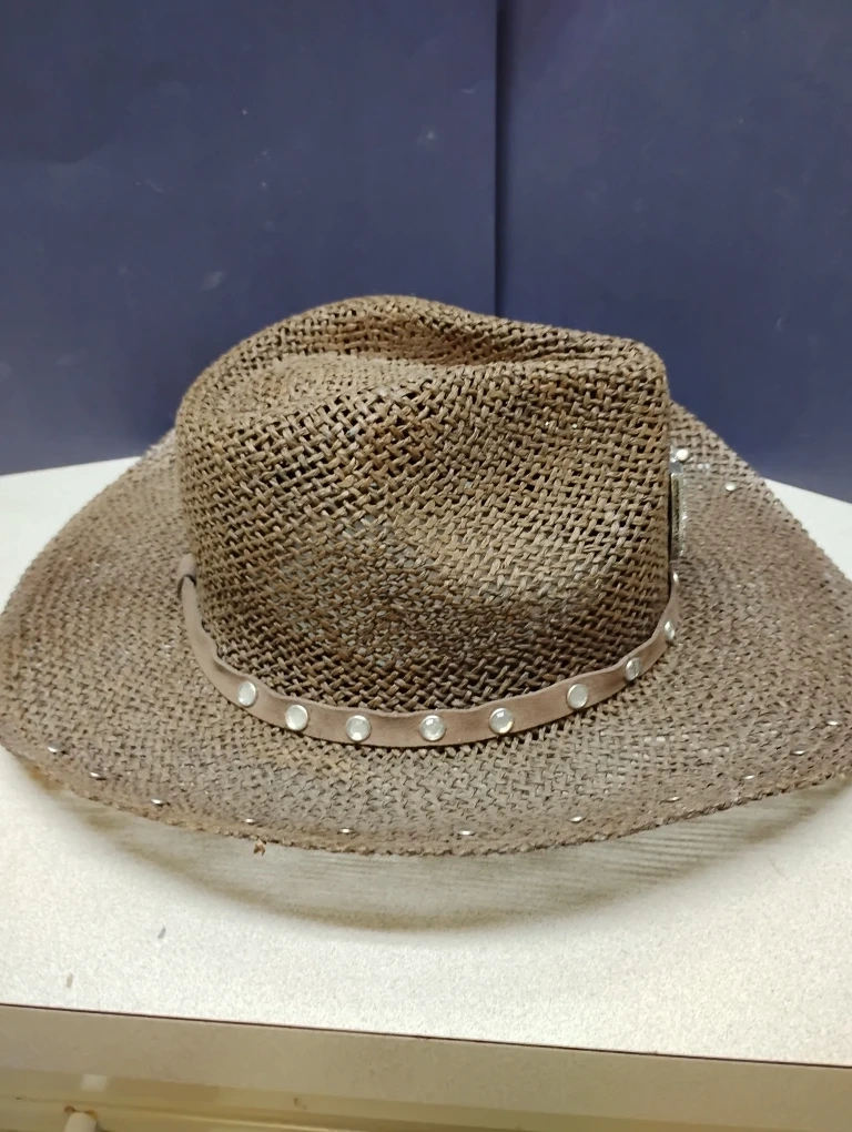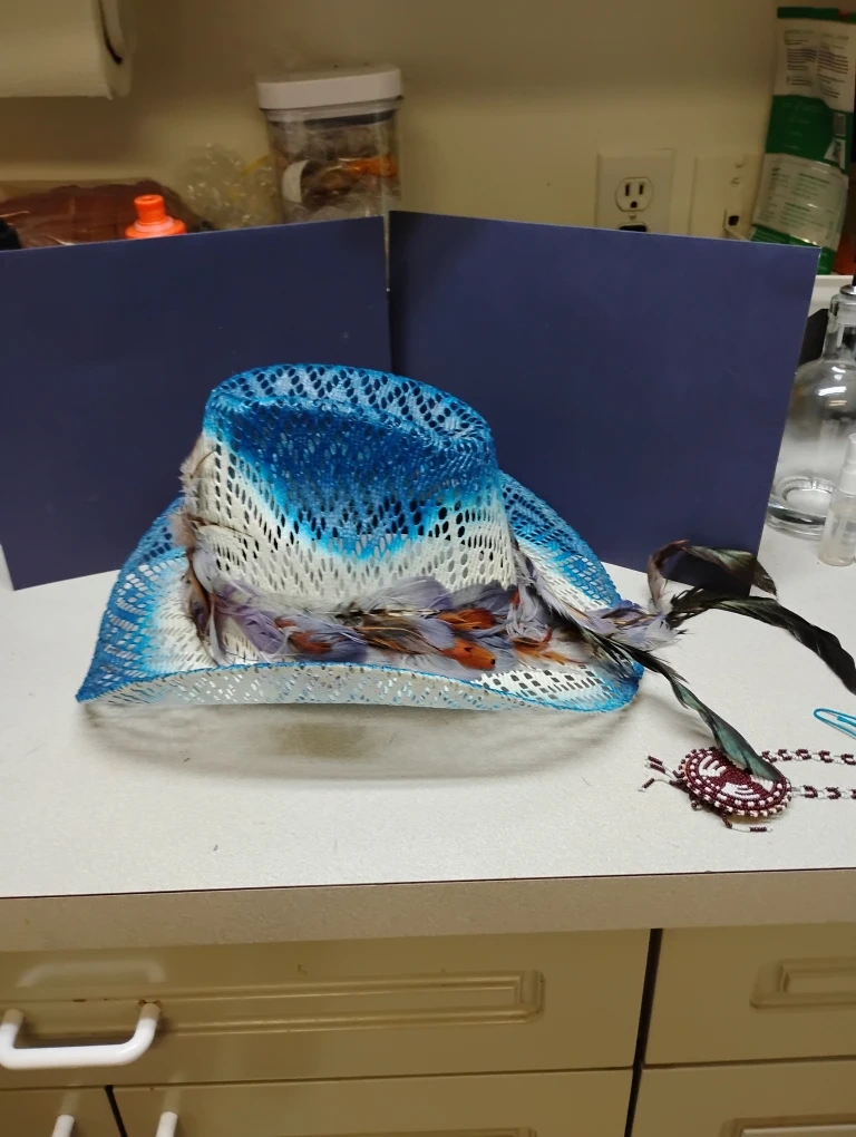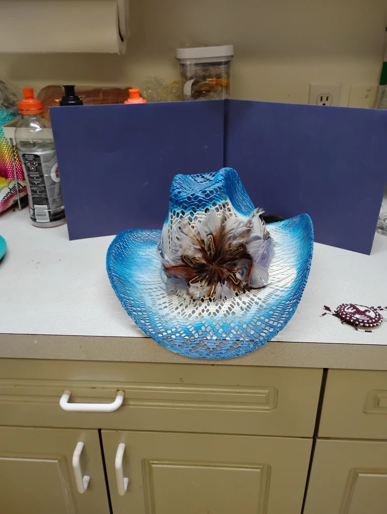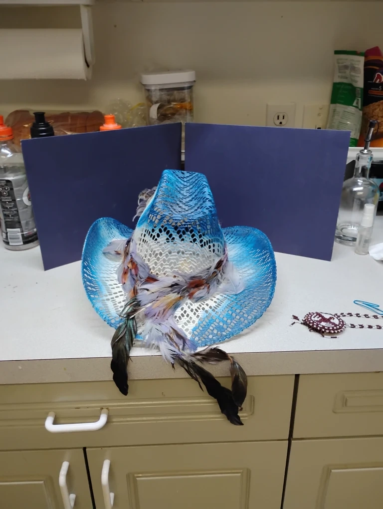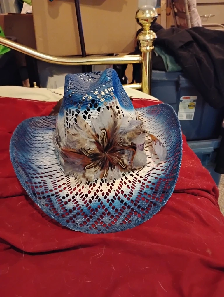 Selling a couple of cowboy hats. One is a light blue and white colour with feathers and the other is a brown straw colour with decorative stones. They are in good condition!