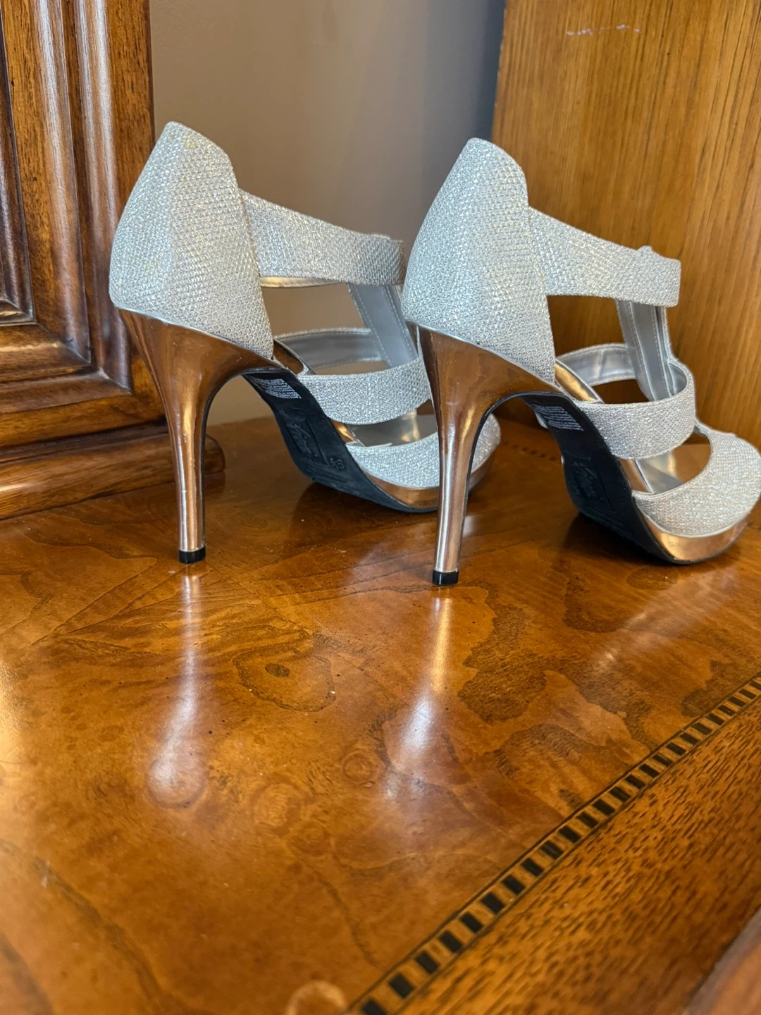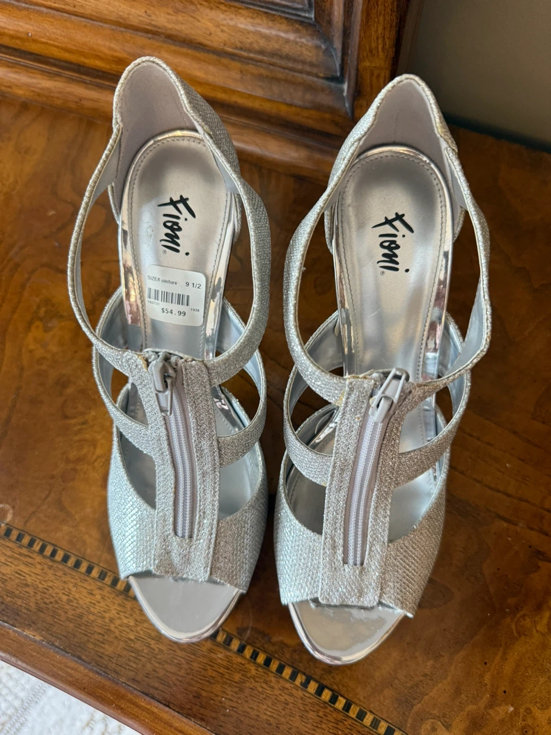 Sparkly Fioni heels with a silver glitter finish. These open-toe sandals feature a zip-up front and a metallic heel. Size is 9 1/2.
