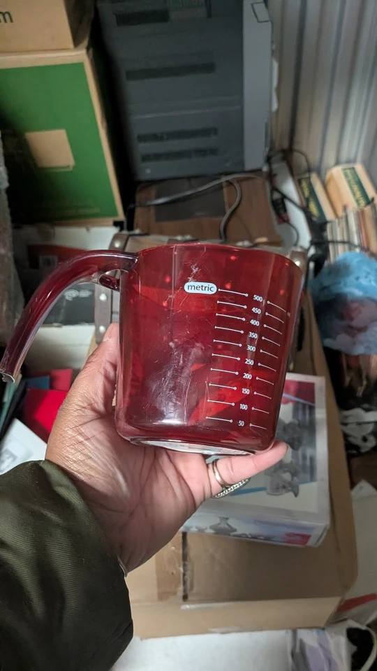 I'm giving away a red measuring cup that can hold up to 2 cups. It also has metric measurements on the side. It's in good condition and ready for a new home!