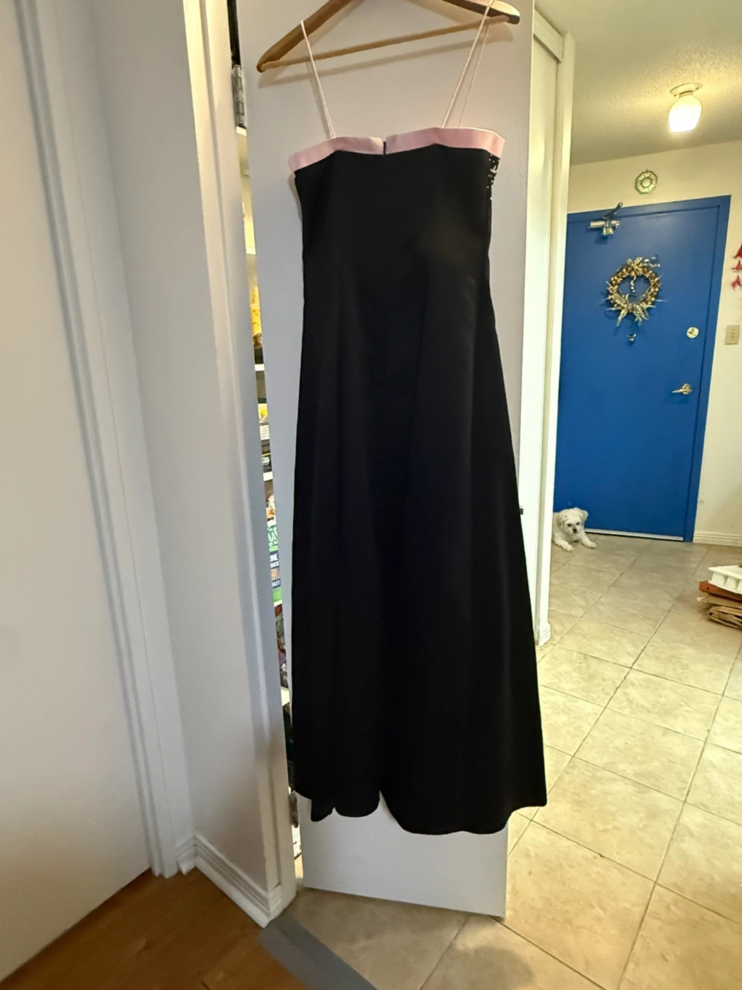 Selling a beautiful black and pink formal dress. It features delicate floral embroidery and a unique lace-up side detail. Perfect for a special occasion!