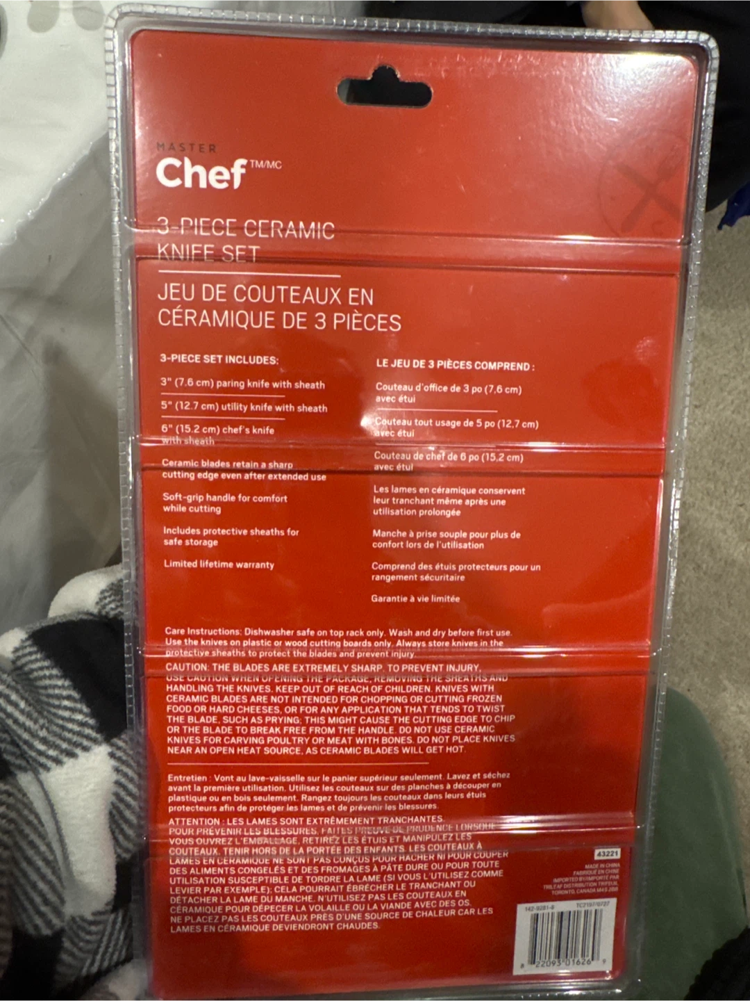 Selling a brand new Master Chef 3-piece ceramic knife set! This set includes a 3" paring knife, a 5" utility knife, and a 6" chef's knife, each with its own protective sheath. The knives feature soft-grip handles for comfortable and safe cutting. The ceramic blades retain a sharp cutting edge even after extended use. Dishwasher safe on the top rack only.