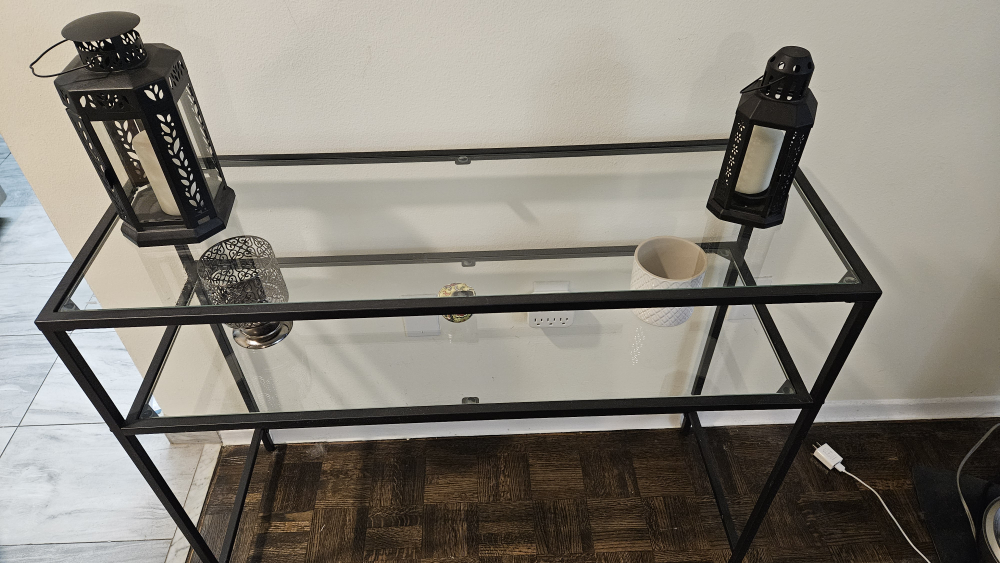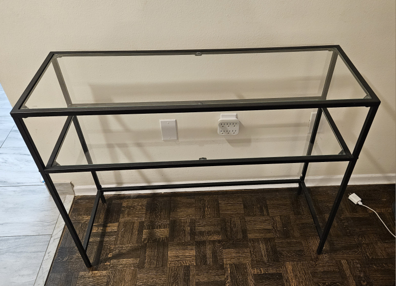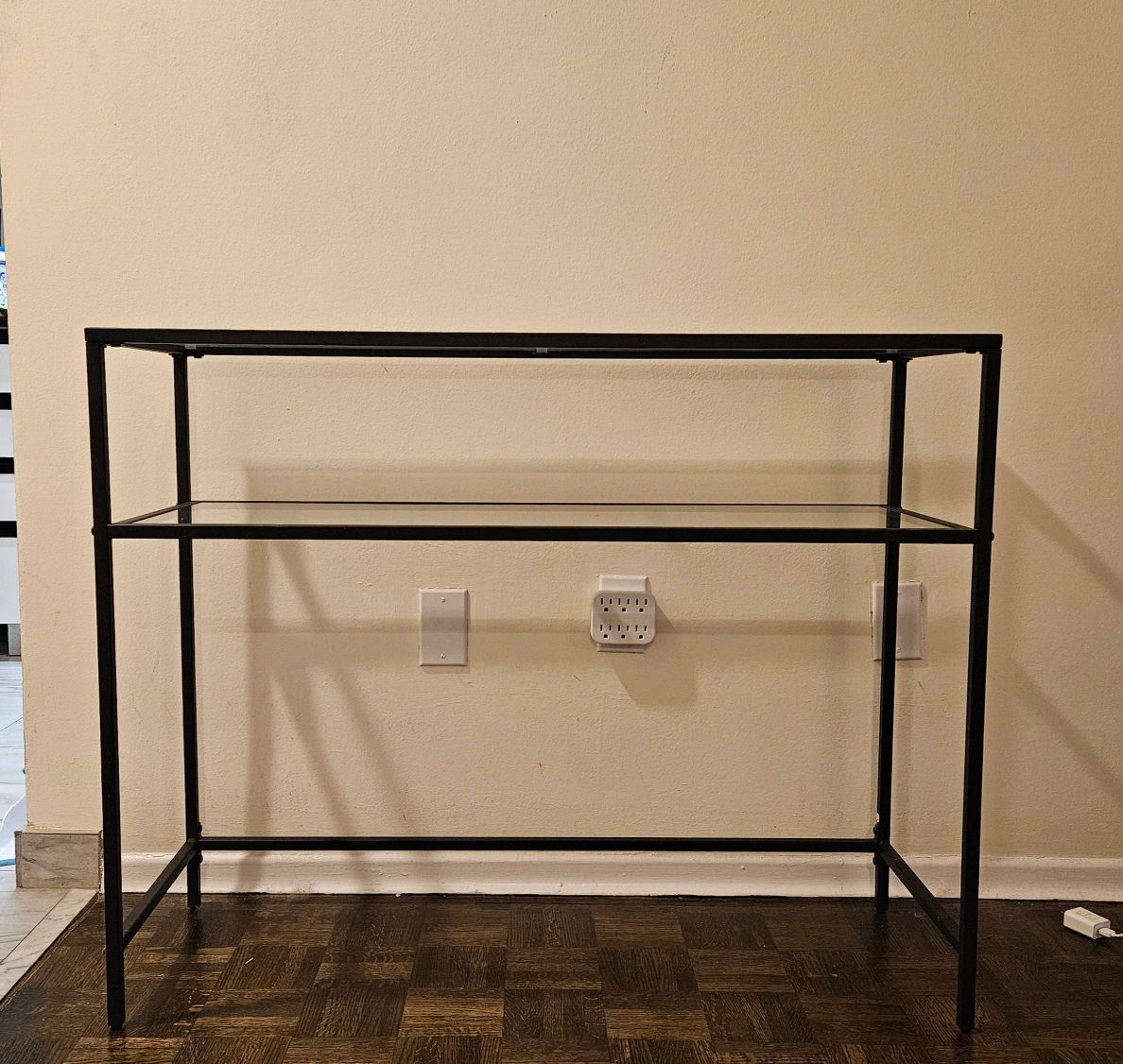 Selling a VASAGLE console entry table in black! It has a modern entryway design with a tempered glass top and a shelf. The frame is metal. Dimensions are 13.8 x 39.4 x 31.5 inches.