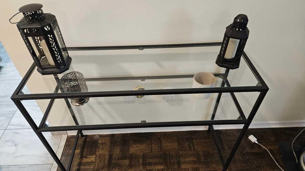 Selling a VASAGLE console entry table in black! It has a modern entryway design with a tempered glass top and a shelf. The frame is metal. Dimensions are 13.8 x 39.4 x 31.5 inches.