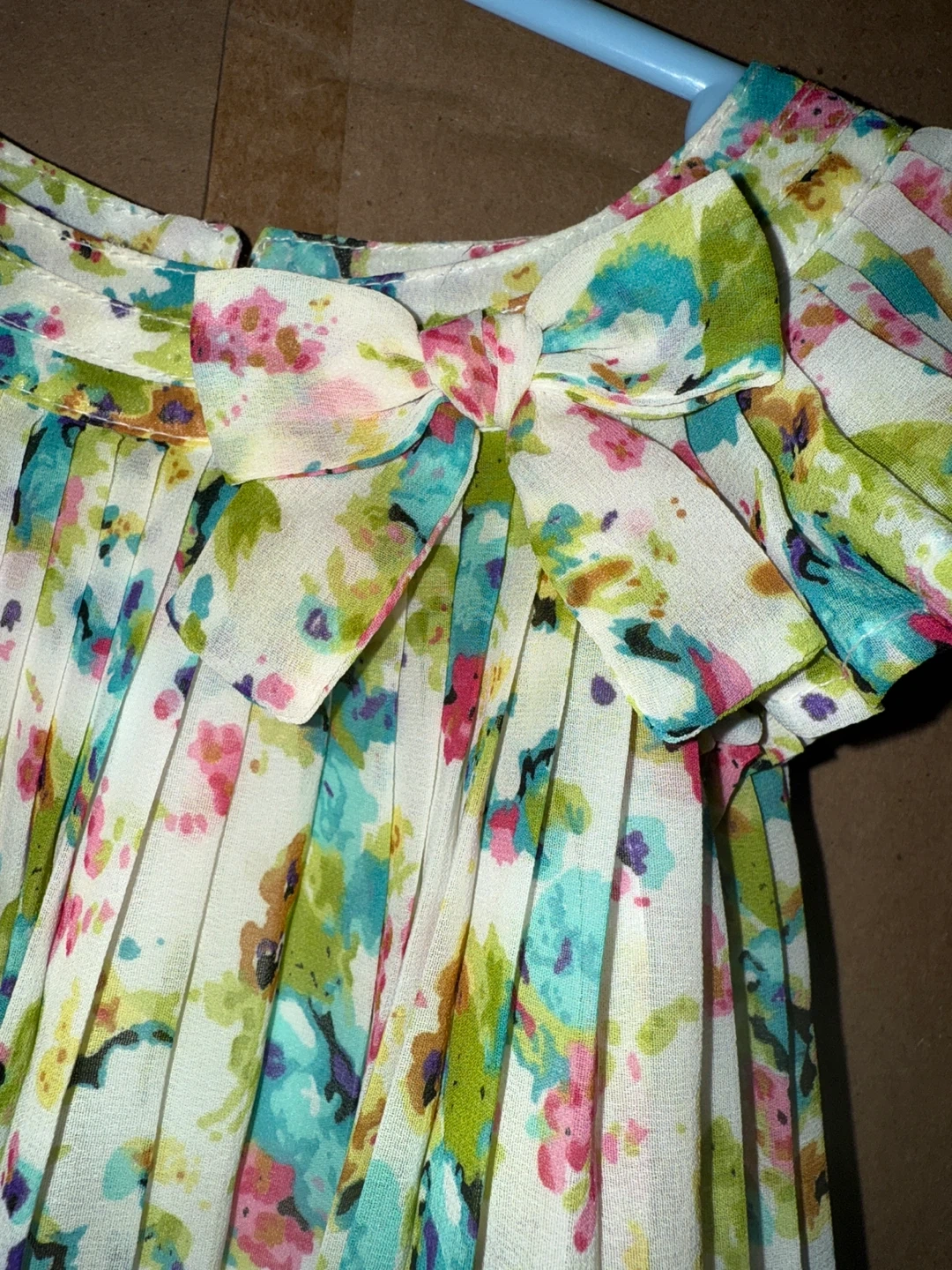 A cute floral print dress, perfect for spring or summer! It features a pleated design and a sweet bow detail on the front. The dress is in great condition and ready for a new home
