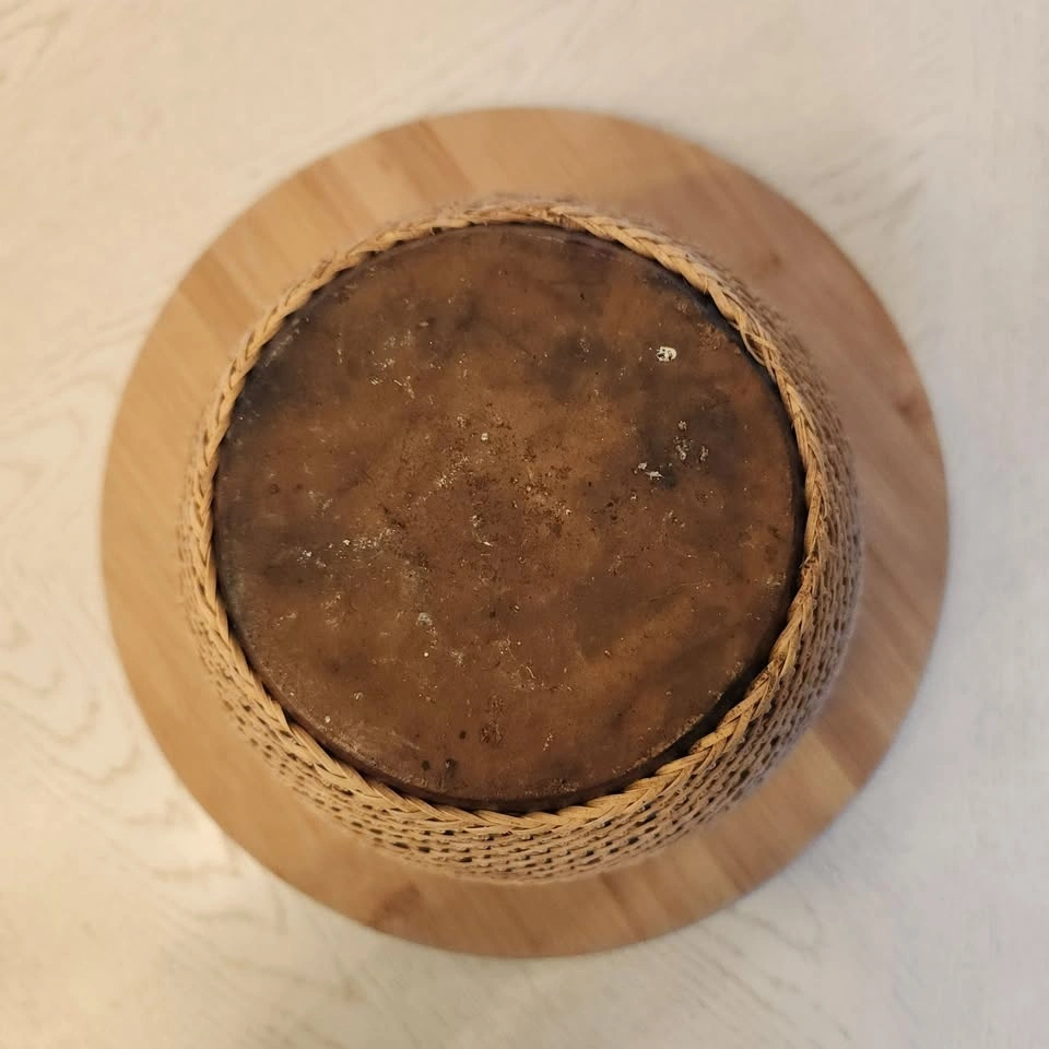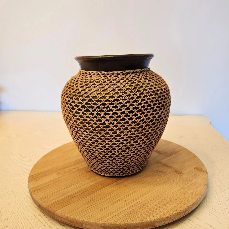 Wow! Look at this amazing vase! It's a dark chocolate brown and wrapped with an intricate reed or wicker weave!