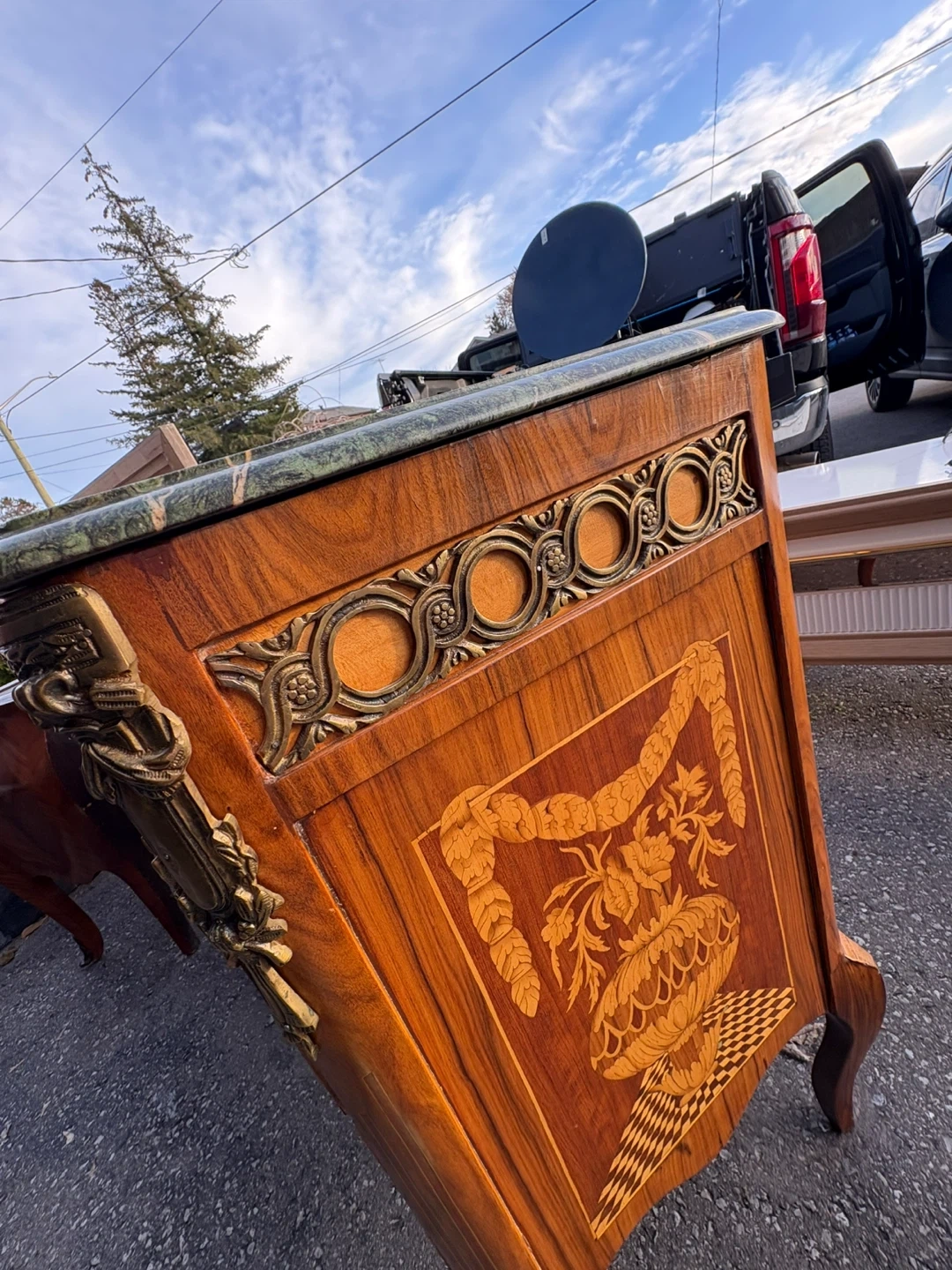 Beautiful antique dresser with marquetry inlay work! The wood has a rich, warm tone, and the marble top adds a touch of elegance. The brass hardware is ornate and detailed, making this a unique piece for any room in your home