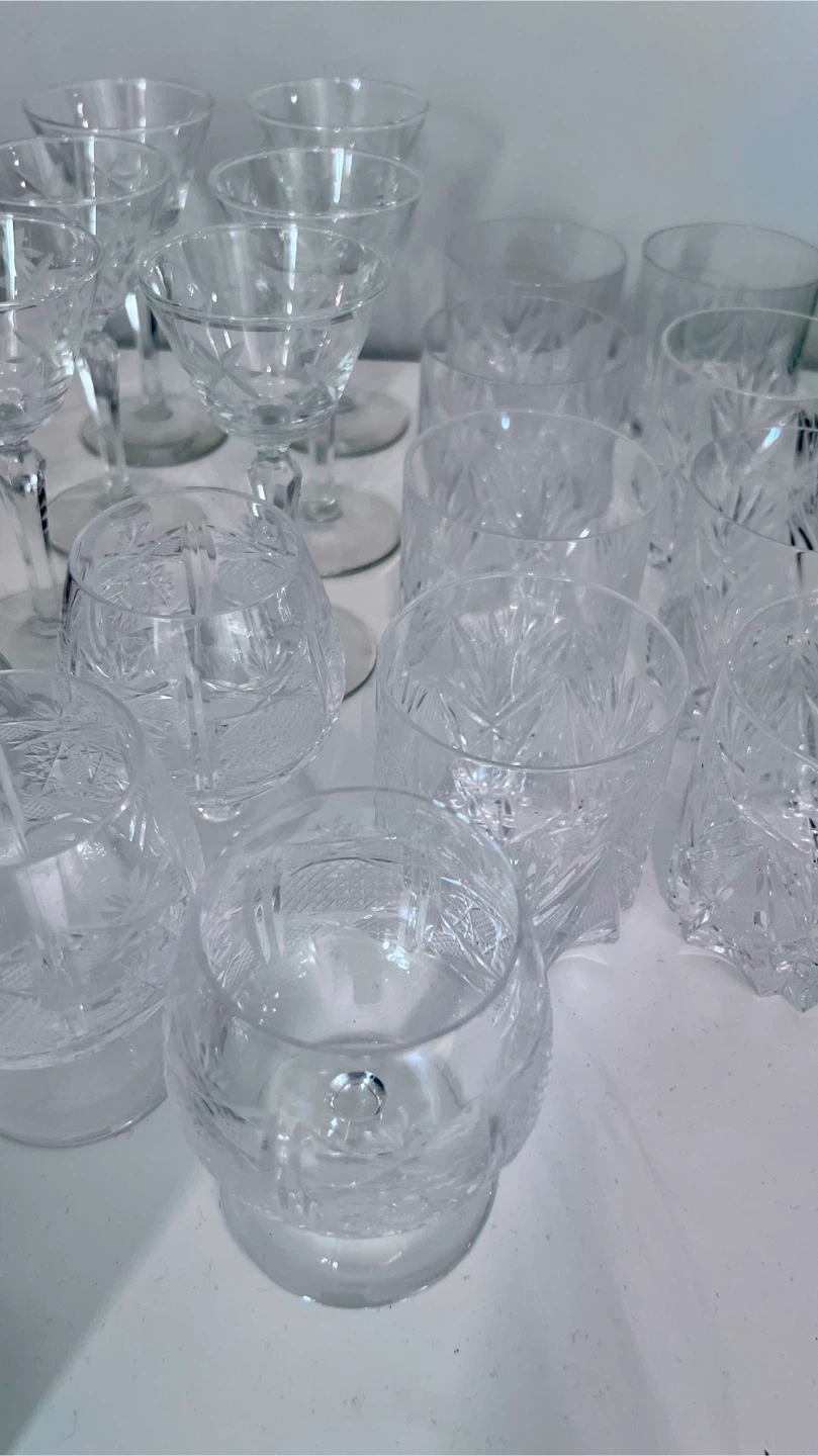 Selling a beautiful antique crystal set. It's in great condition and would be a lovely addition to any home. The clear crystal design catches the light beautifully, making these standout piece for a home bar or displaying flowers or as a decorative accents (bowls). The vase, bowls are heavy as they are real crystal, not glass.