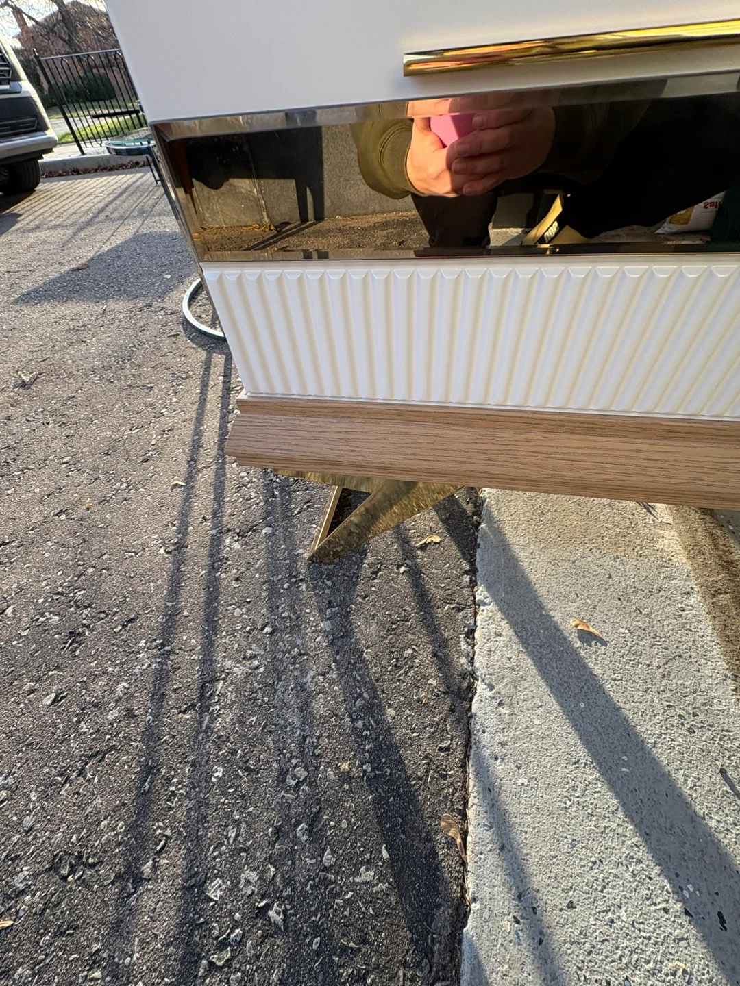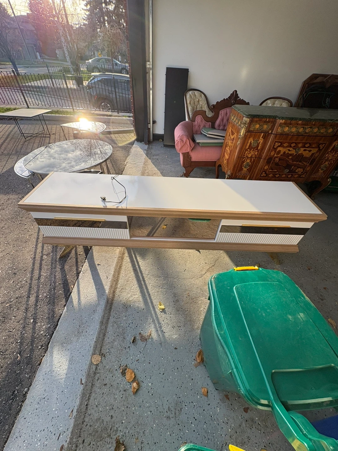 Selling a stylish fireplace TV stand! It features a clean white top with wood accents and a built-in electric fireplace. Perfect for adding a cozy touch to your living room while providing functional storage and display space for your TV and media components