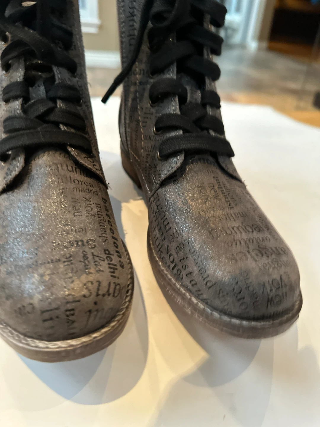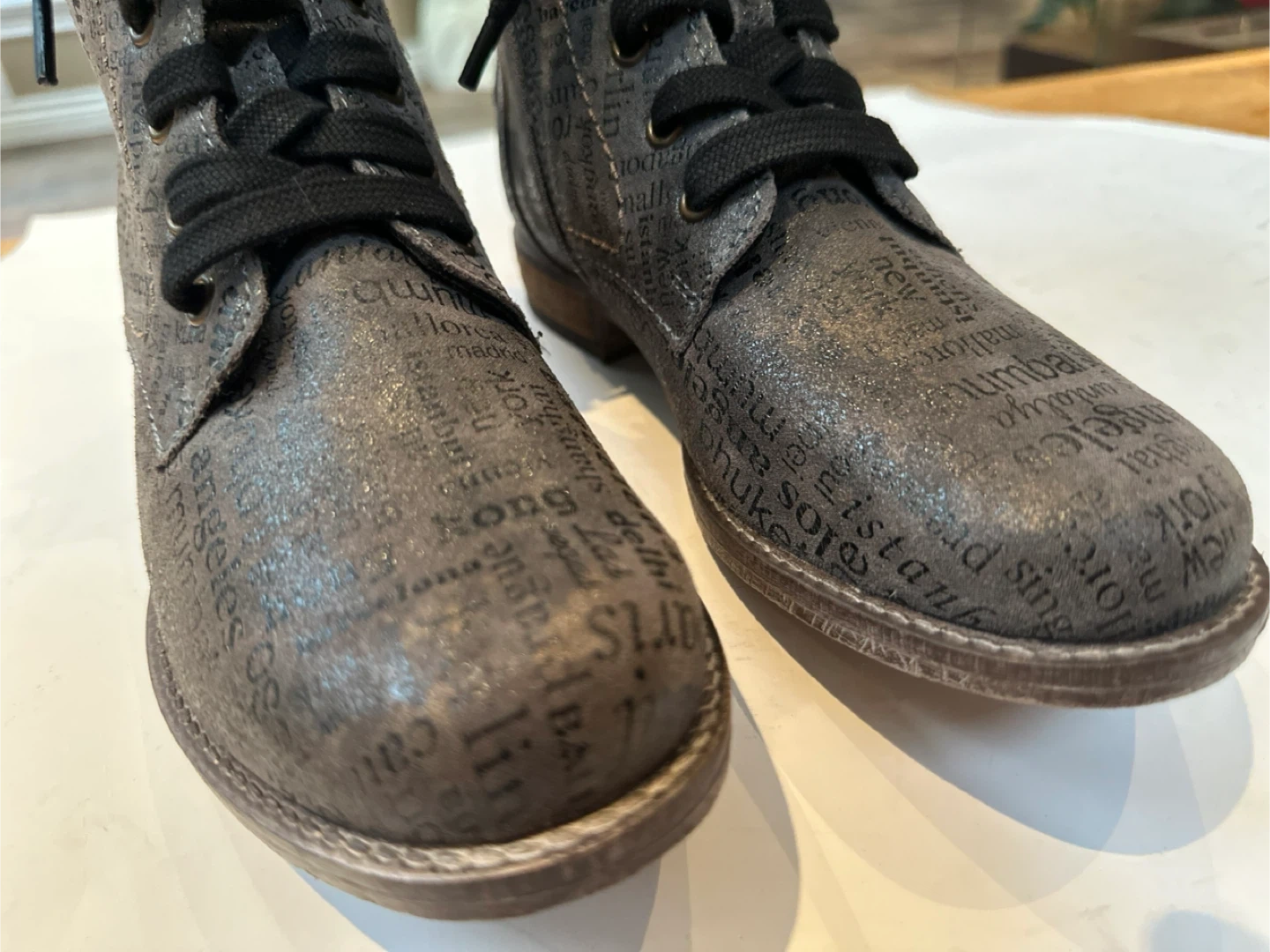 Unique sparkly grey leather design with city names printed all over. Lace up with side zipper for easy access.