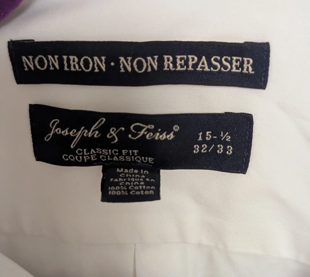 I'm selling a Joseph & Feiss dress shirt in a classic fit. It's a size 15 1/2 with a 32/33 sleeve length. The shirt is white and made of 100% cotton. It's also non-iron, making it easy to care for!