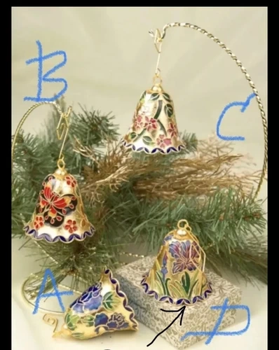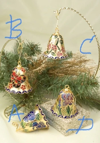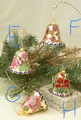 Hand crafted Cloisonné Enameled Christmas Bell Ornament About 2” tall Very light but sturdy and much better option than fragile glass ornaments! Copper base enameled by hand and plates with 10k gold over Lasting beautiful heirlooms for your Xmas tree Personalization can be added upon request on the inside - see last photo - date or initials please request by messaging me when purchasing Come gift boxed Please choose a design from the list Sold by 1 piece PLEASE SPECIFY WHICH DESIGN YOU D LIKE TO ORDER BY ADDING A LETTER IN THE ORDER NOTES STYLES - A B C D E F G H !!!!!!!!!!!!!!!!!!! Discount is available on qty