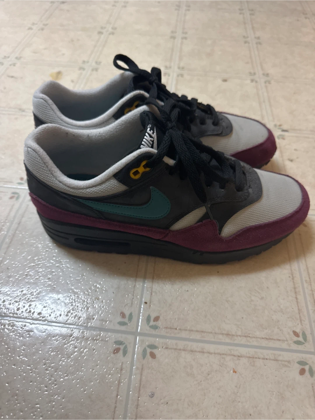 Selling a pair of Nike Air Max 1 shoes! They feature a stylish mix of grey, black, and burgundy. These shoes are perfect for adding a pop of colour to your outfit while staying comfortable.