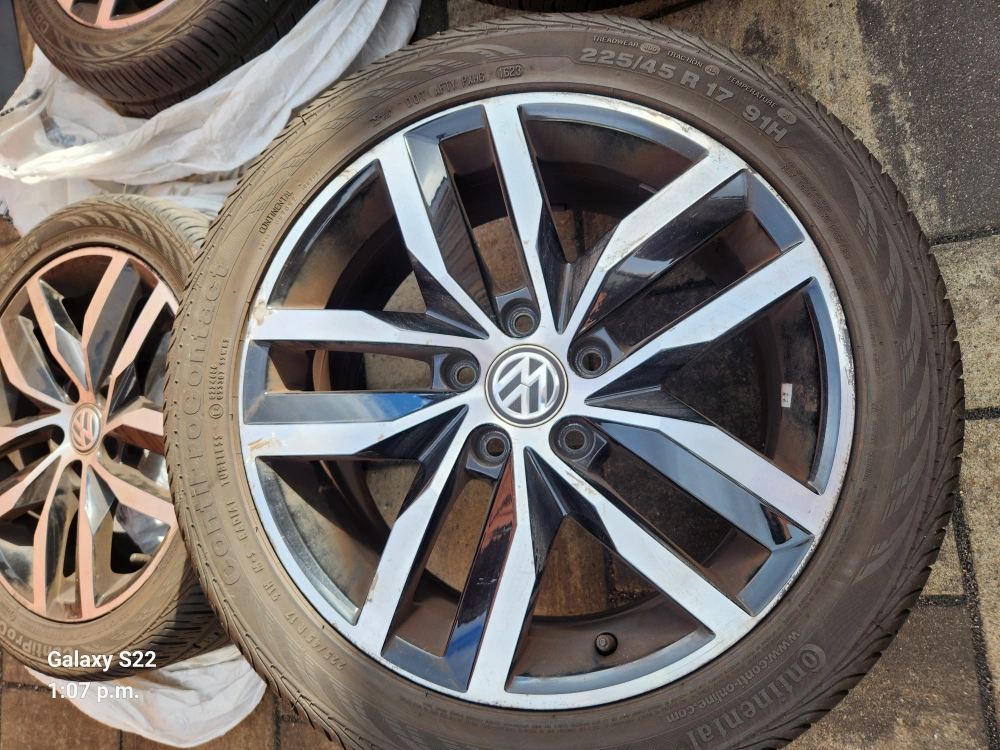 Selling a Volkswagen wheel with All-Season Continental tires. The tire size is 225/45 R17. Good for anyone looking to replace a wheel or tire! There are so.e scratches on wheels but tires are perfect. Used only one season.