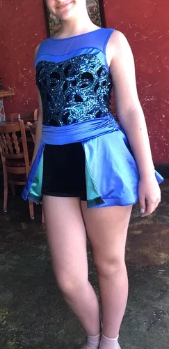 Dance costume girls, Size 11-12. Worn once. Like new condition. Blight cobalt blue. Shorts with back over skirt. Very pretty. Great value. Paid $120.
