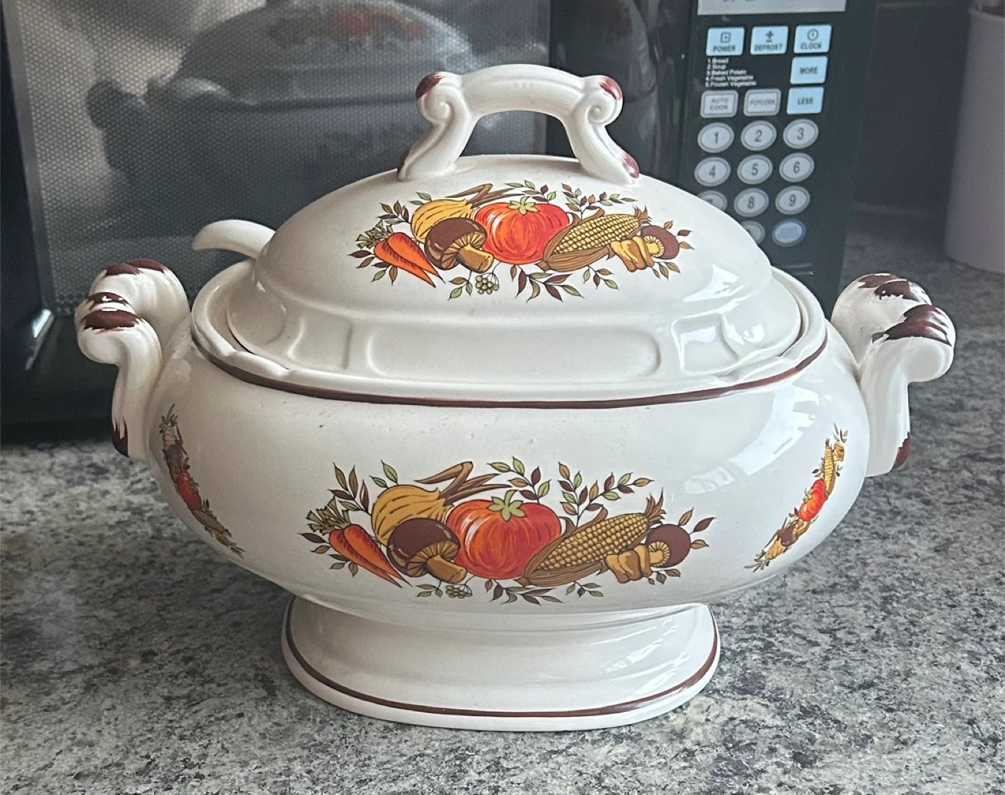 Here's a lovely vintage soup tureen for sale! It features a charming vegetable pattern with carrots, corn, tomatoes, and mushrooms. It has a lid and a spoon, perfect for serving up your favourite soups and stews.