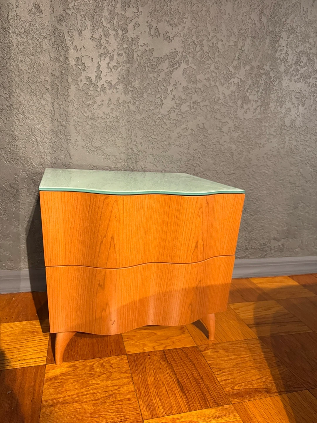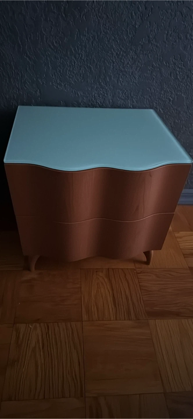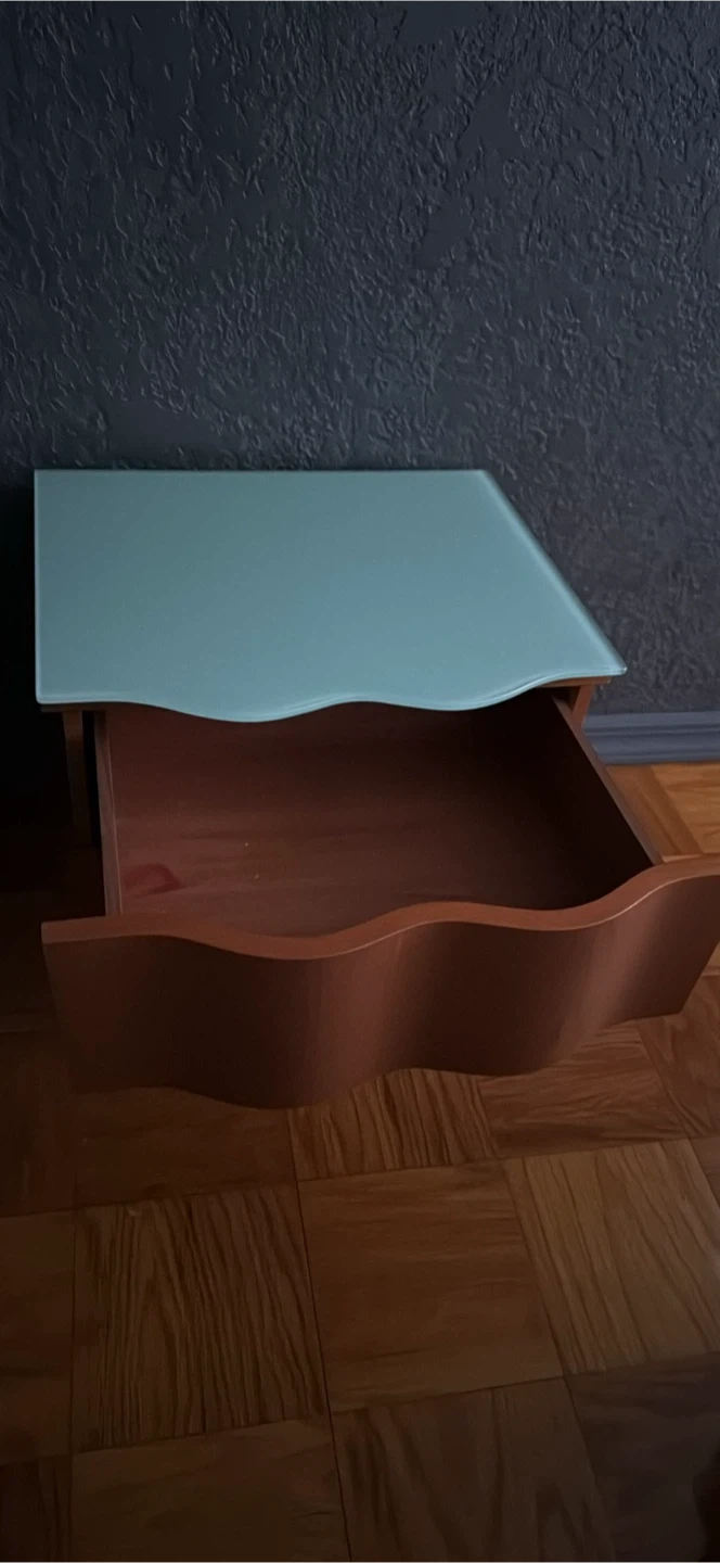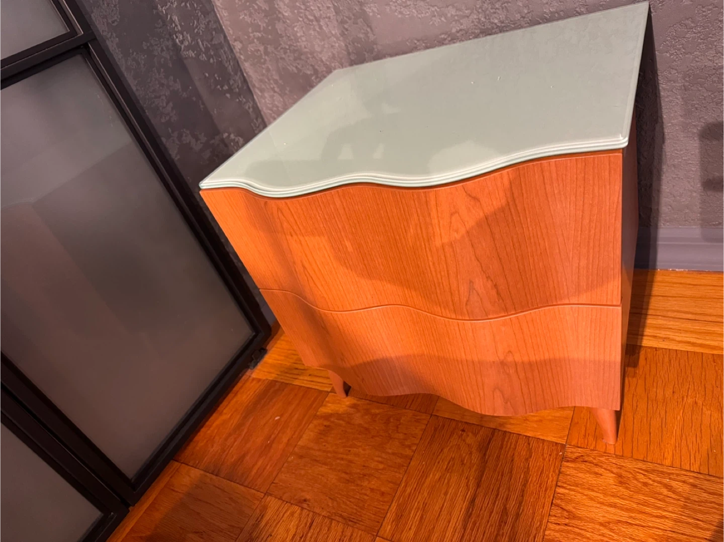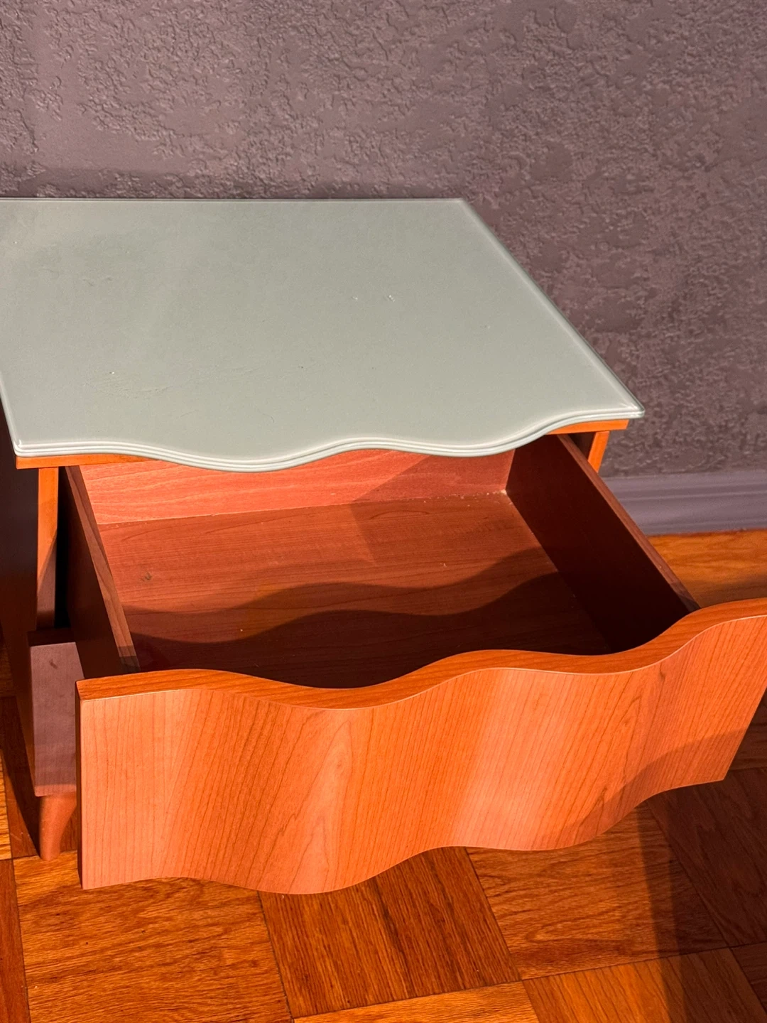 Nice wood nightstand with a glass top. It features a unique wavy design on the drawer fronts, adding a touch of style to any bedroom. Perfect for storing bedside essentials!