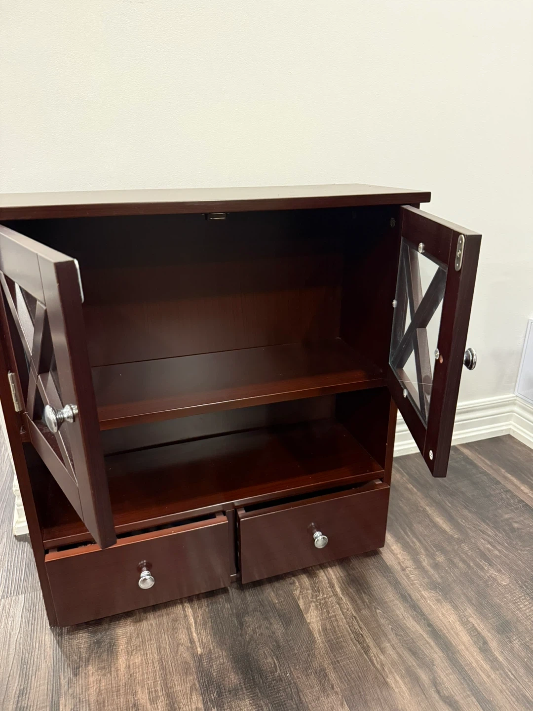 Selling a lovely brown wooden cabinet. It features glass doors with a cross design and two drawers at the bottom. It's perfect for adding a touch of elegance to any room!