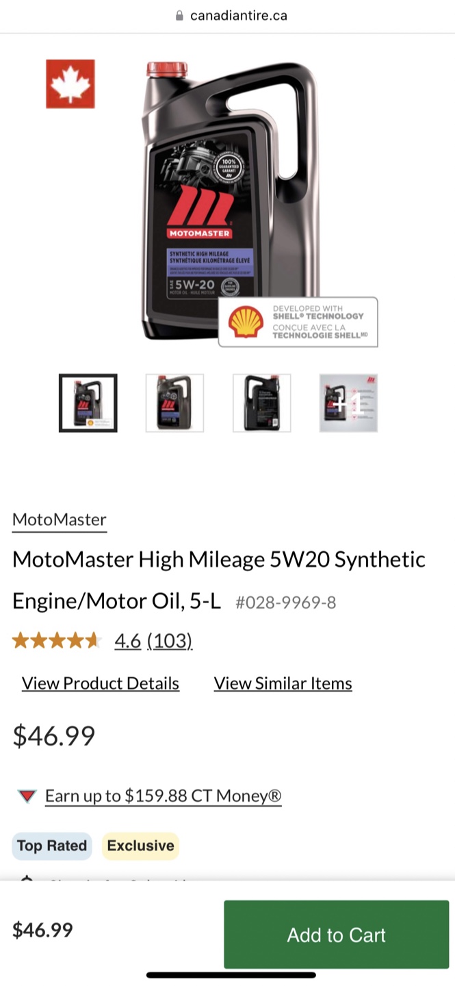 SYNTHETIC MOTOR OIL 5W20 - MOTOMASTER High Milage - 5 Litres
