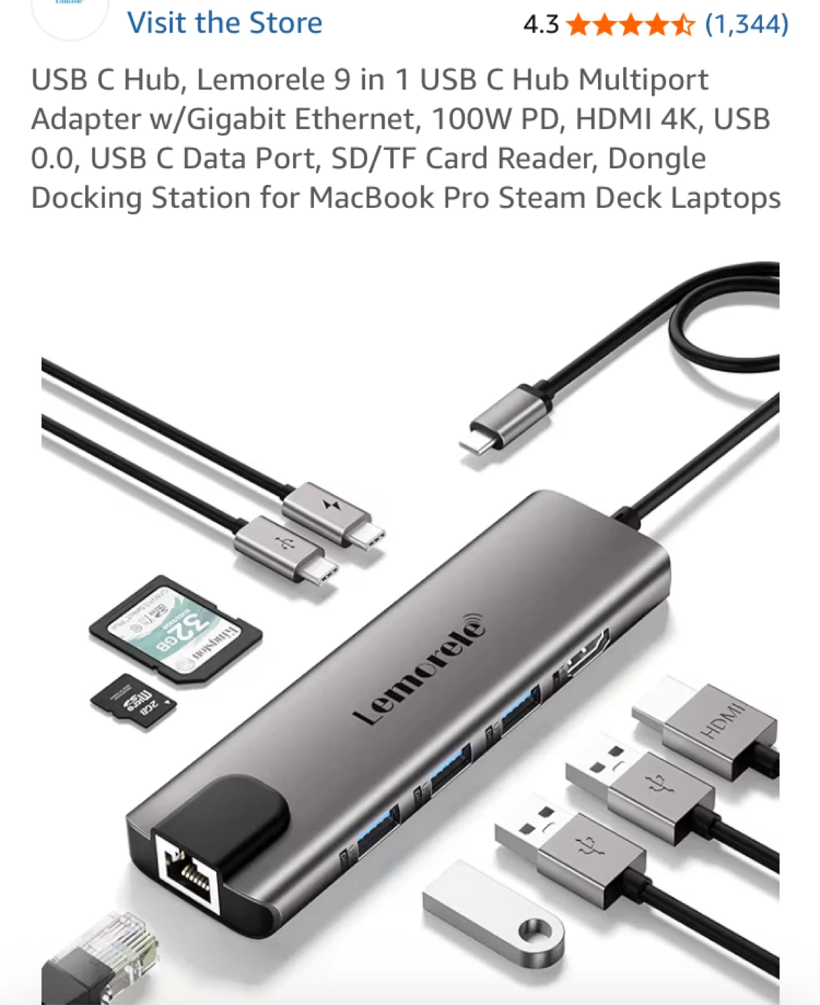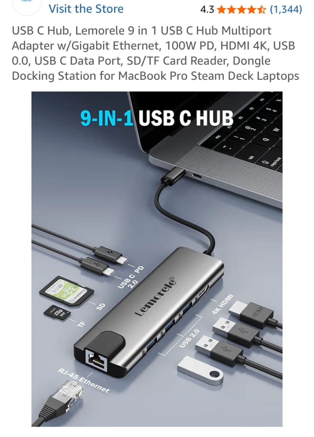 Selling a Lemorele 9-in-1 USB C Hub Multiport Adapter. This adapter features Gigabit Ethernet, 100W PD, HDMI 4K, USB 0.0, USB C Data Port, and SD/TF Card Reader. It's a dongle docking station perfect for MacBook Pro, Steam Deck, and other laptops. It provides stable wired access up to Gigabit and supports 10/100/1000Mbps Lan Network