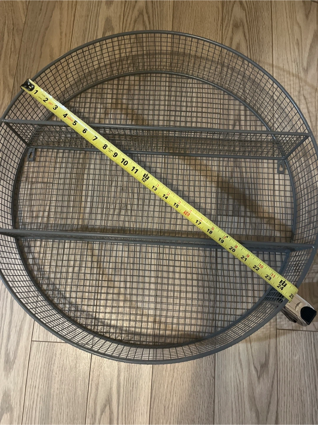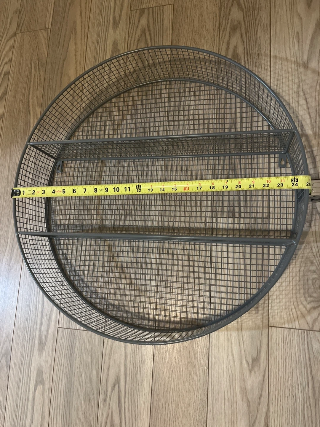 Add a unique touch to your home decor with this round metal wall shelf! It features a gray finish and a sturdy wire construction, perfect for displaying your favorite items. This shelf is in great condition and ready to bring some style to your space