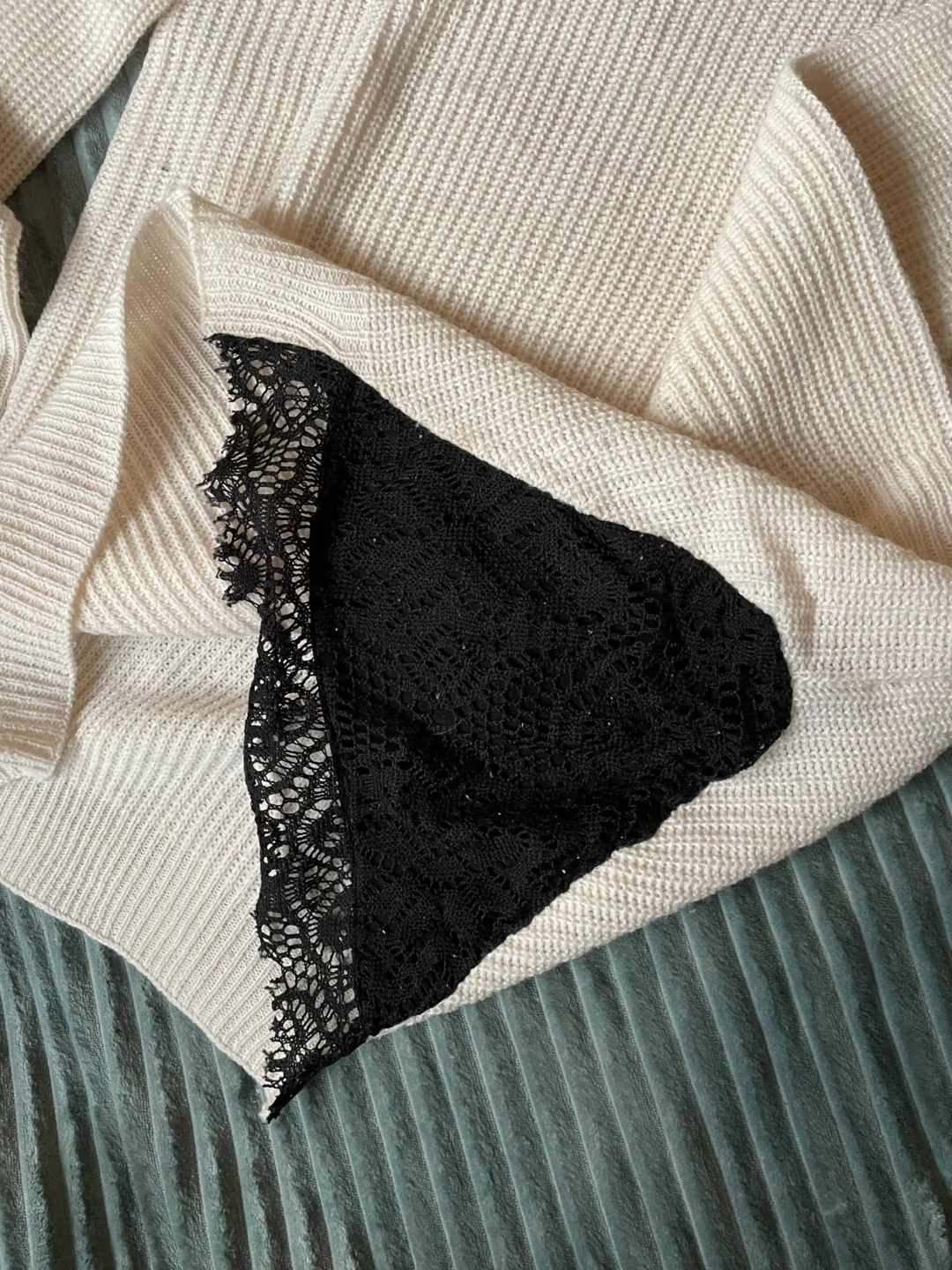 Cozy cream-coloured turtleneck sweater by Evelyn Taylor! It's a size medium and made of 100% acrylic. The sweater features a unique black lace detail.