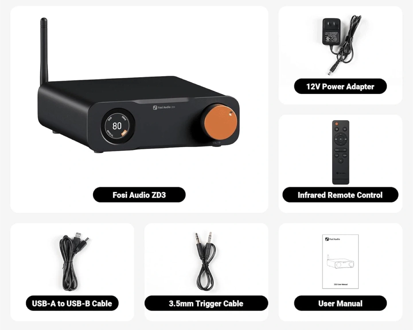 Selling a like-new Fosi Audio ZD3 DAC. It comes with the box and all included components like the 12V power adapter, infrared remote control, USB-A to USB-B cable, 3.5mm trigger cable, and user manual. More information on the product here - https://a.co/d/b0XjqGh
