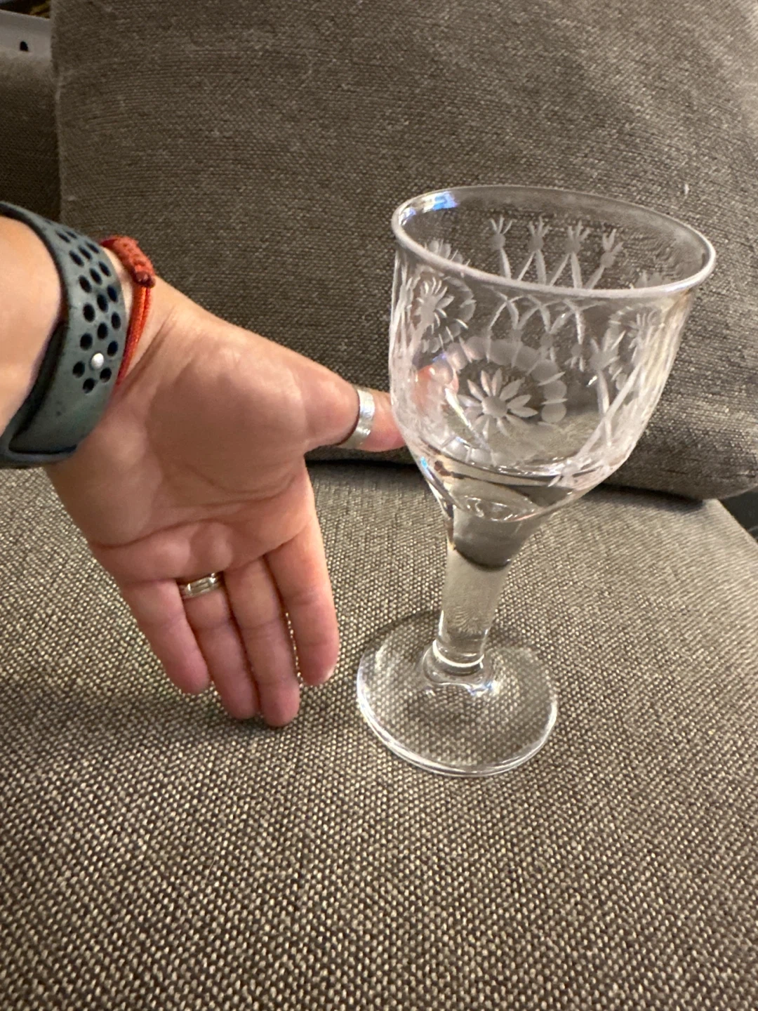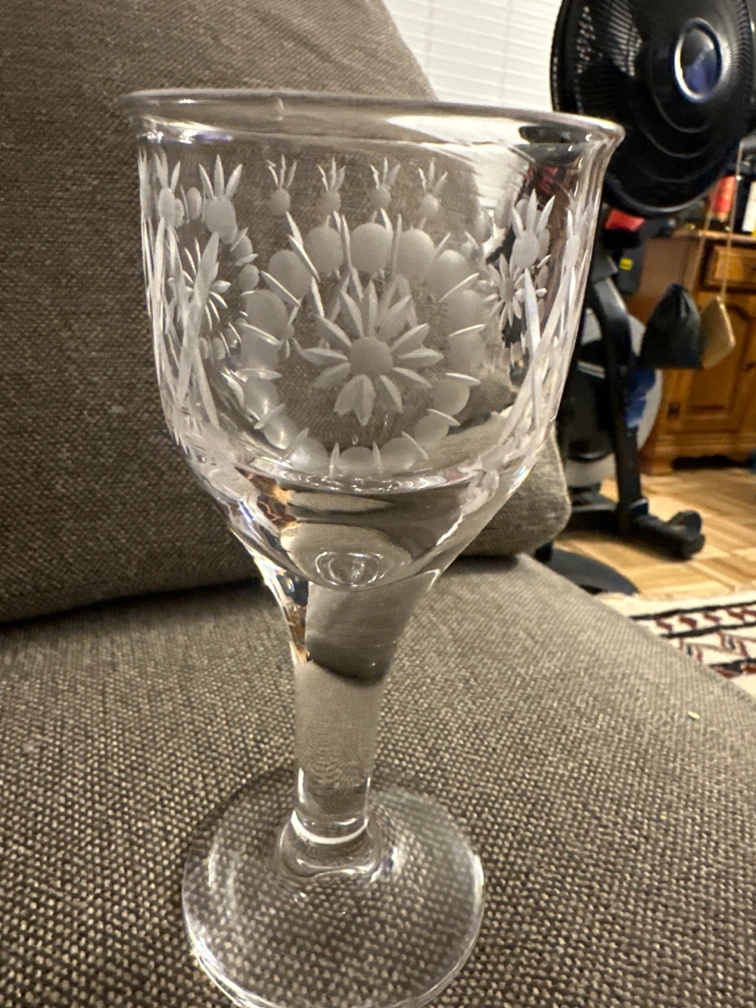 Selling a beautiful etched glass wine goblet. It has a lovely floral and geometric pattern etched into the glass. Perfect for adding a touch of elegance to your table setting!