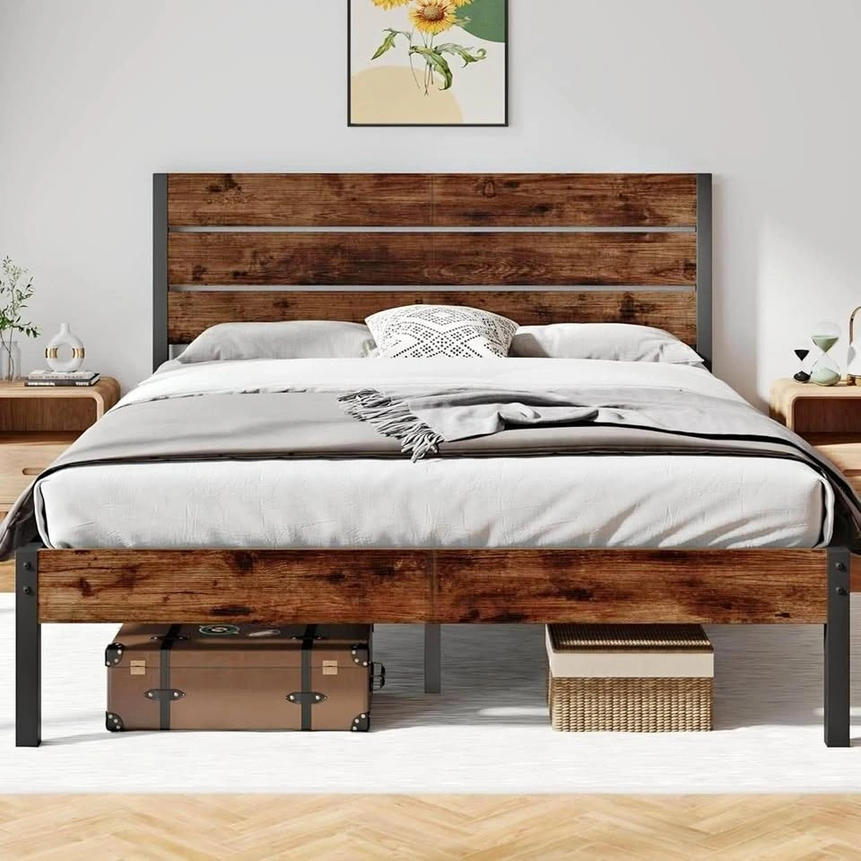 Upgrade your bedroom with this rustic brown queen bed frame featuring a stylish wood-accented headboard and footboard on a sturdy all-metal structure. Built with 13 metal slats + 9 reinforced legs, it supports up to 800 lbs and stays squeak-free thanks to noise-reducing foam padding.